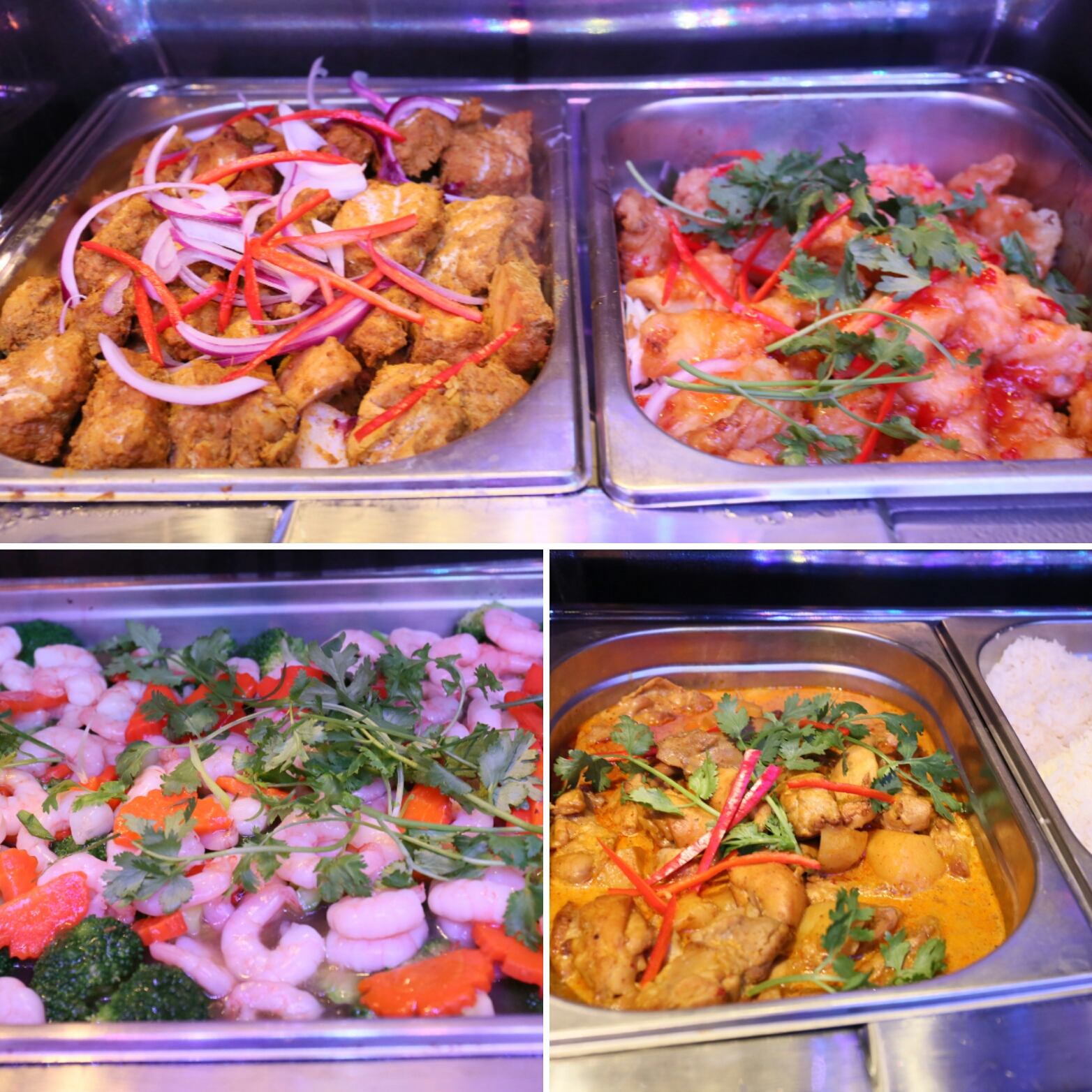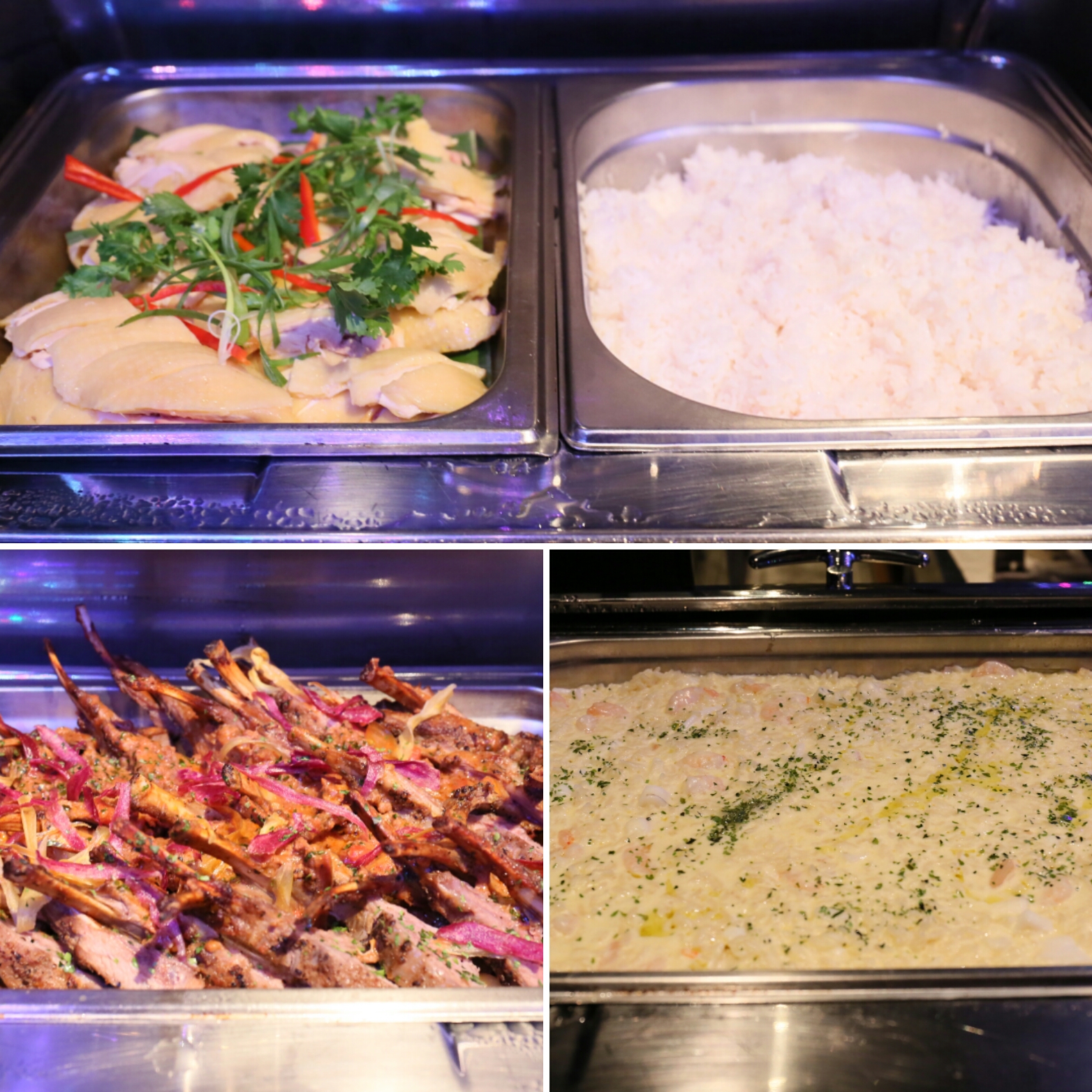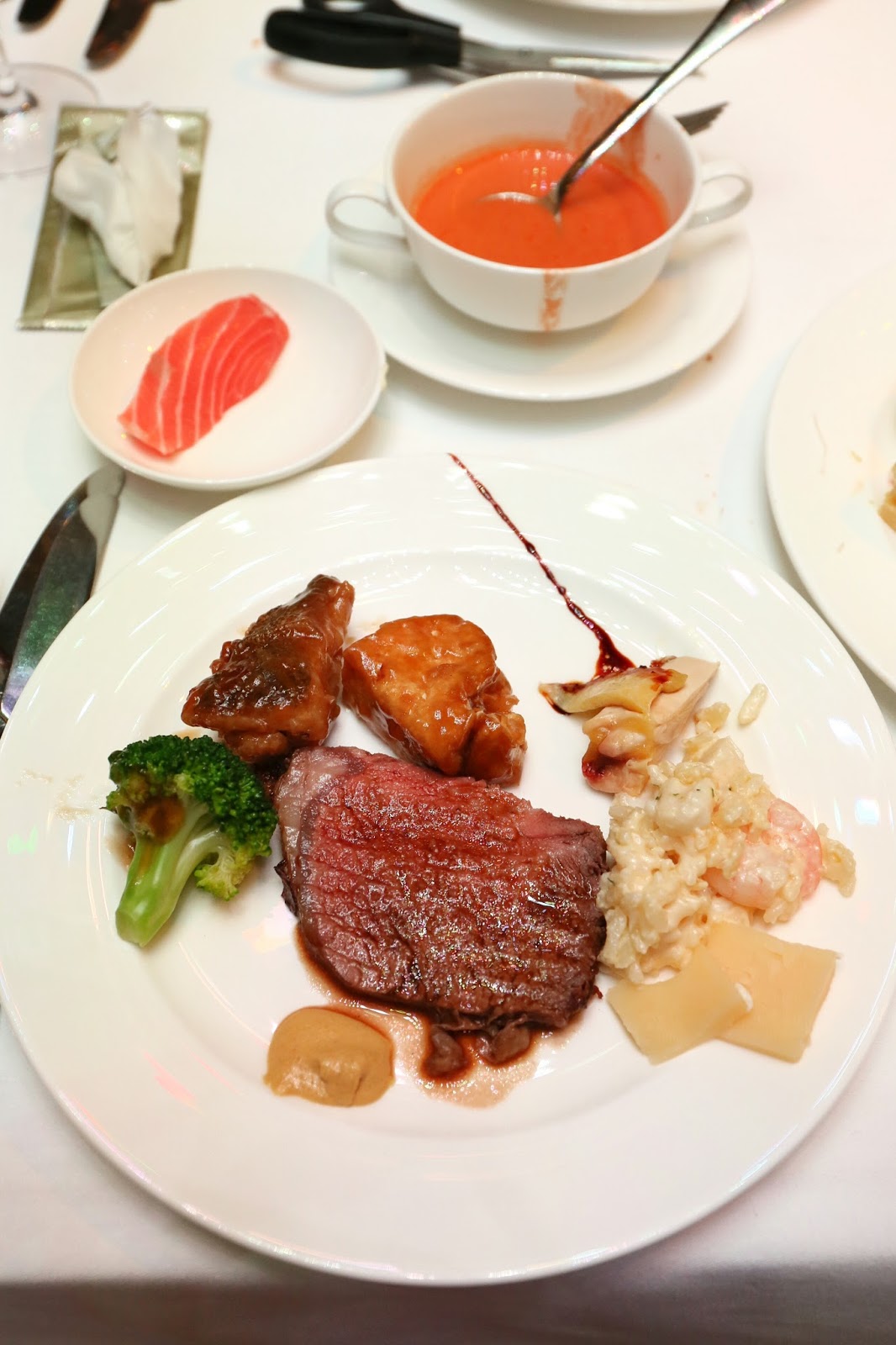其他熱盤還有:配菜的翠玉瓜、紅蘿蔔、烤薯;芝士肉醬千層麵 (美味!!)、烤豬肋骨、印度咖哩烤魚柳、泰式酸辣魚柳、西蘭花炒大蝦、星洲咖哩雞 (很香!!)、海南雞飯配三色醬、烤焗羊架、海鮮燴意大利飯 (口感美妙!!),以及花尾龍躉燴豆腐西蘭花,等等。