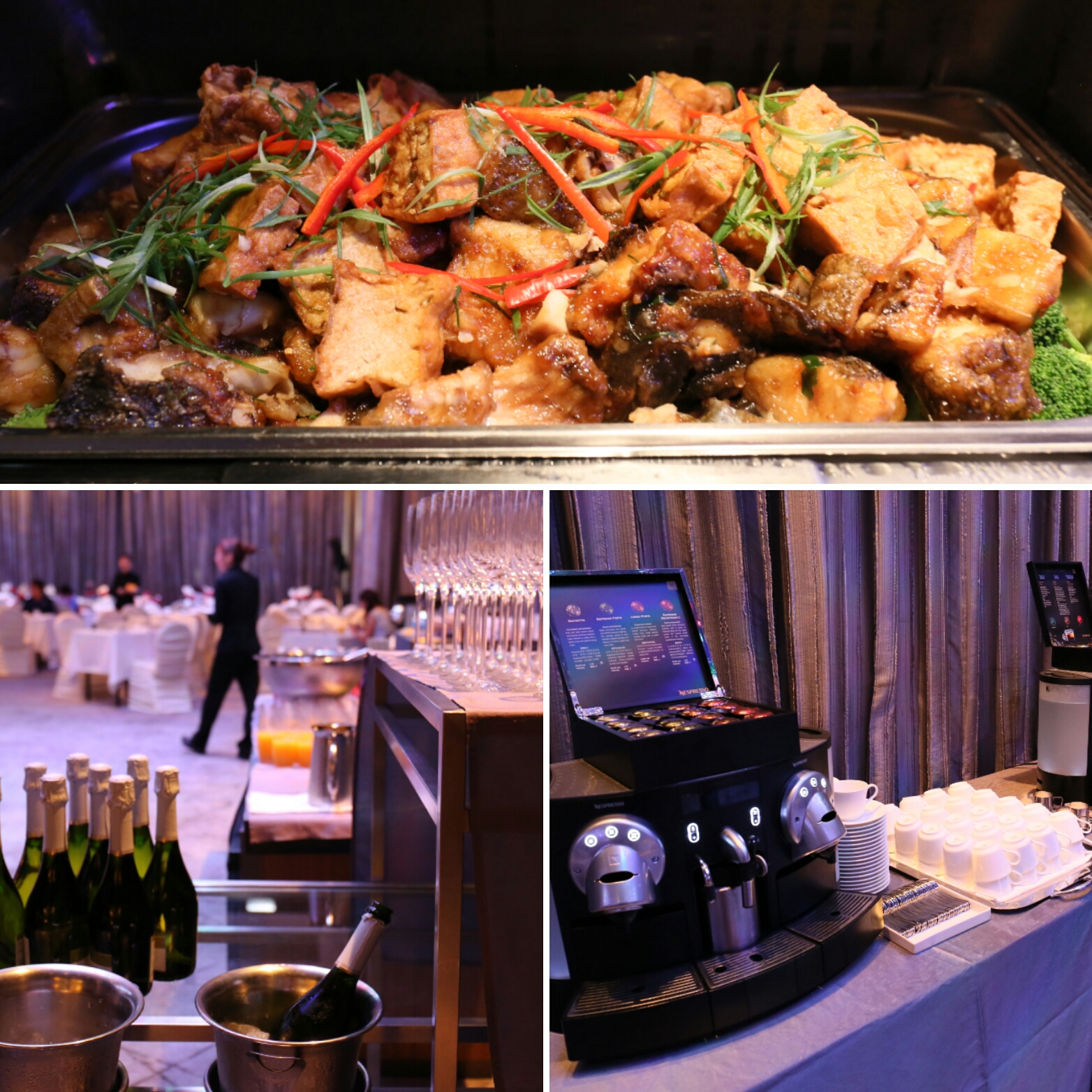 飲品方面有橙汁、汽酒、Tea WG 茗茶並 Nespresso 優質咖啡任飲;另一對角則還有滑雞粥,以及香濃的喇沙湯麵區。