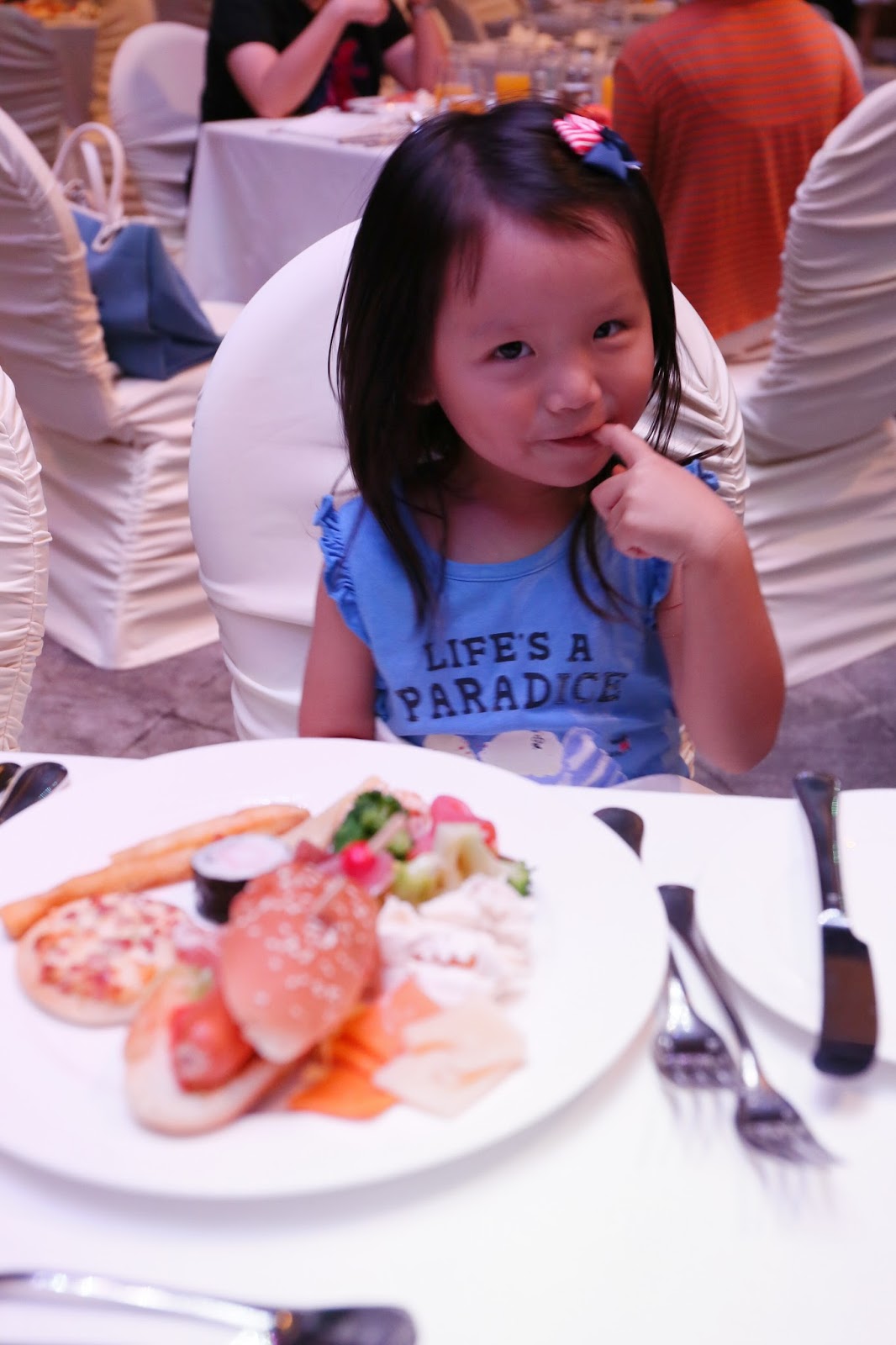 Matthew上午還要上畫班,媽媽和Chloe先來,小人兒一來就取了壽司、熱狗、薄餅、芝士、海南雞等等,非常開心!
