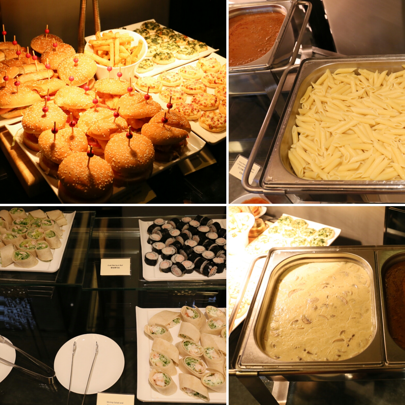 還未完!外邊還有專為小食客而設的魚柳包、牛肉漢堡包、熱狗、迷你薄餅、薯條、蟹柳壽司、兩款薄餅卷、白汁蘑菇/茄汁肉醬長通粉區,全是小孩的至愛呢!