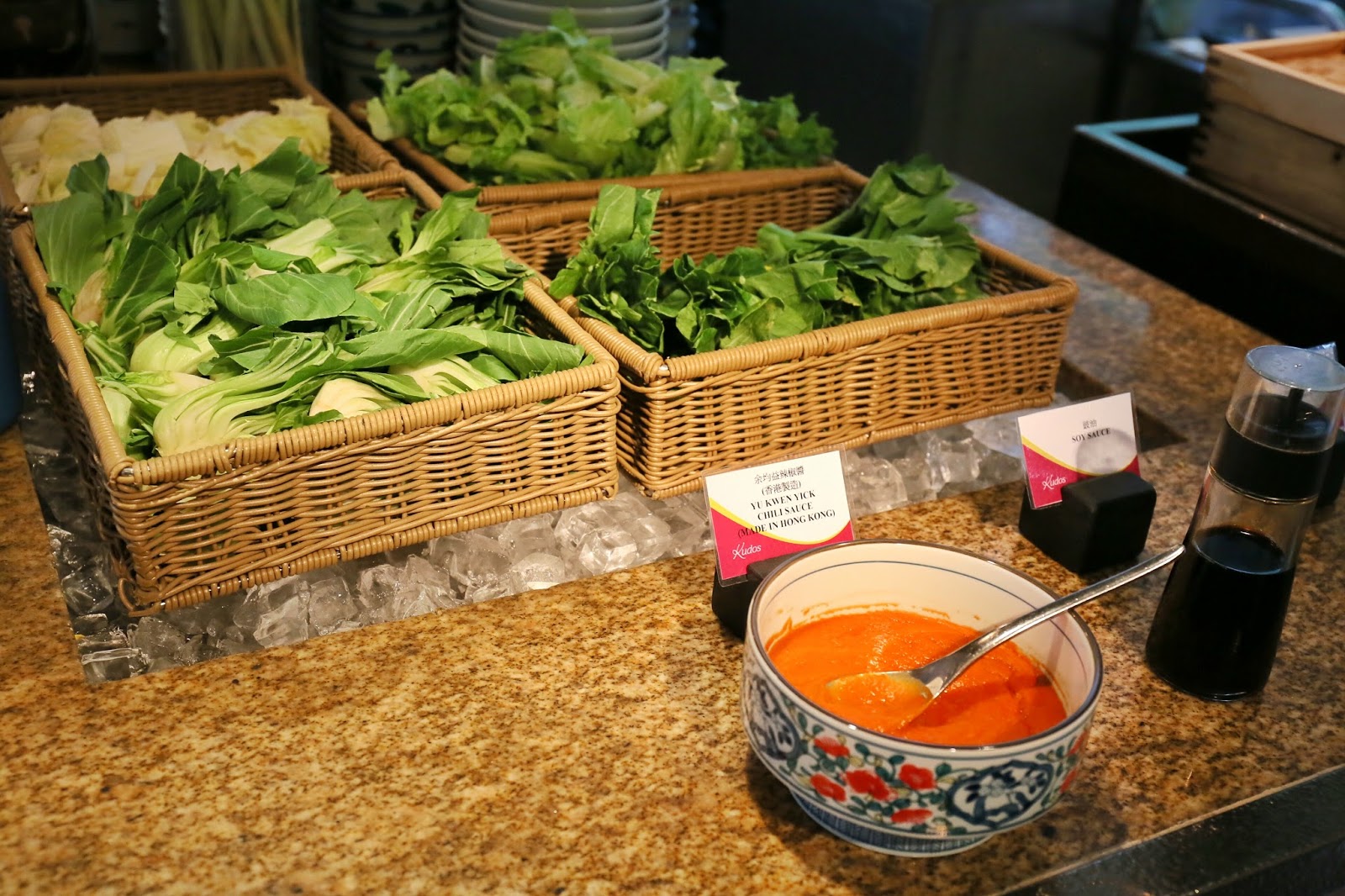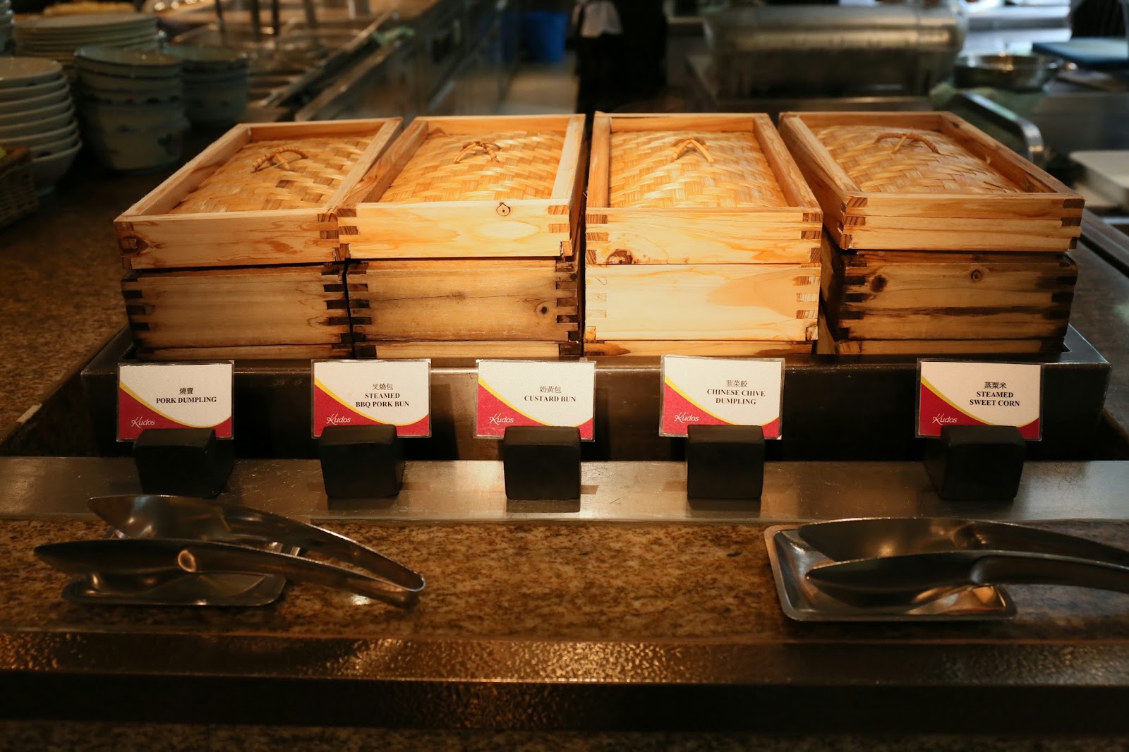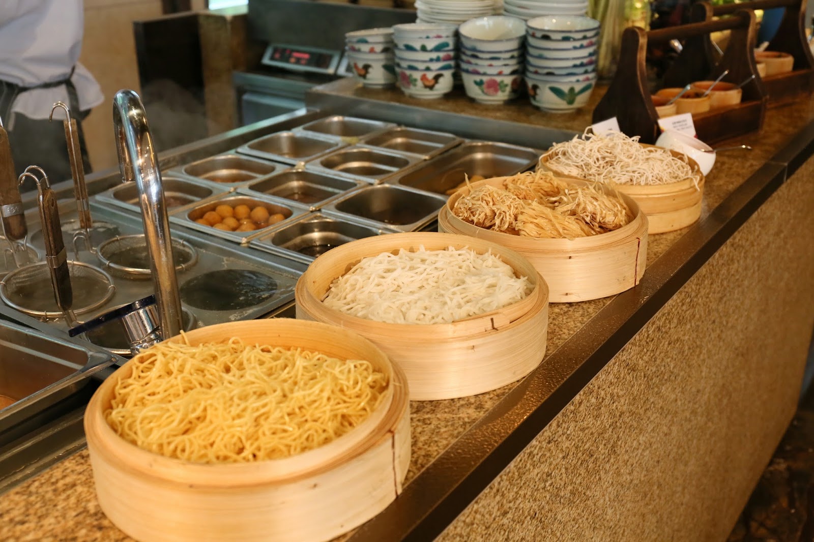 之後是車仔麵檔,它不像大部分酒店 buffet 只是配角綠葉,而是精心搜羅多款地道食材如辣魚蛋、豬大腸、滷冬菇、豬紅等,麵及蔬菜也有多款選擇,最後連余均益辣椒醬也出動,非常認真!