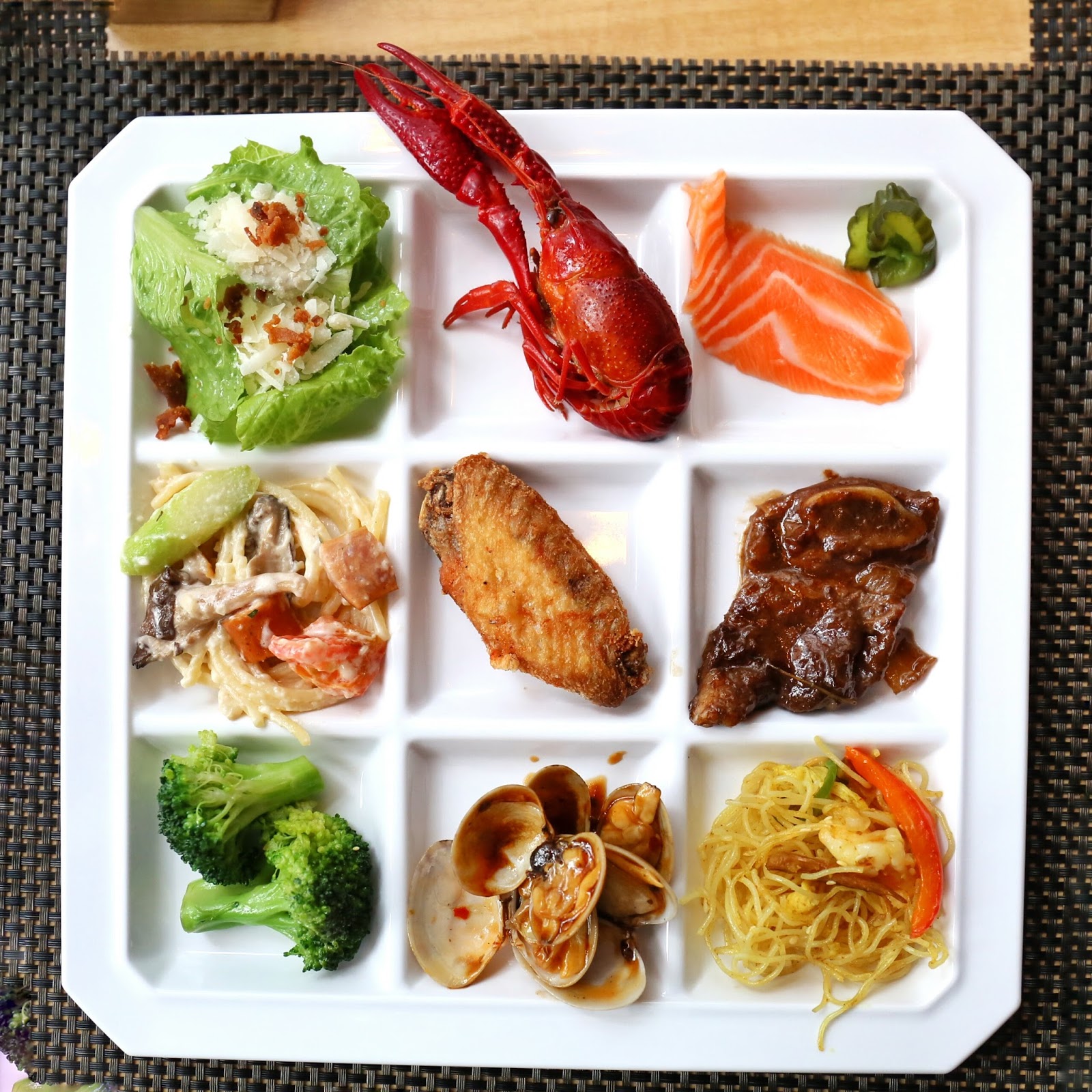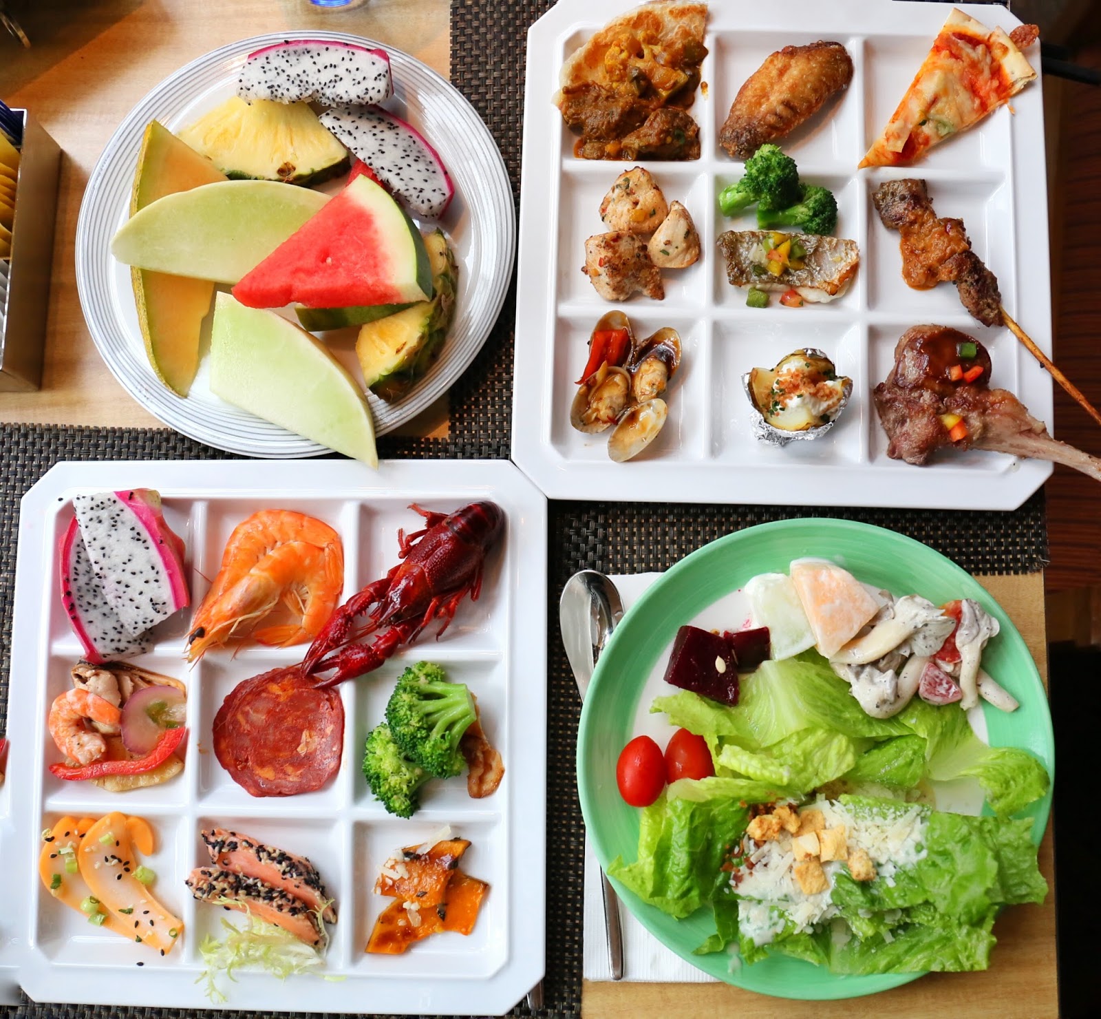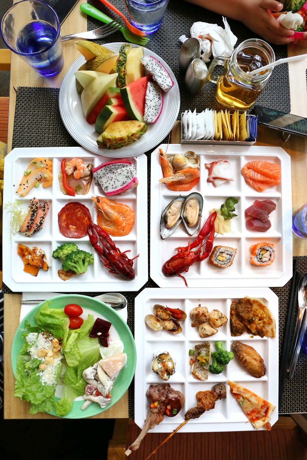 然後又照辨煮碗,取了更多的海鮮、刺身、壽司、沙律、沙律、冷盤,甚至是熱盤,再加上額外打底水果及沙律。由圖可見,這格仔碟真的很萬能!