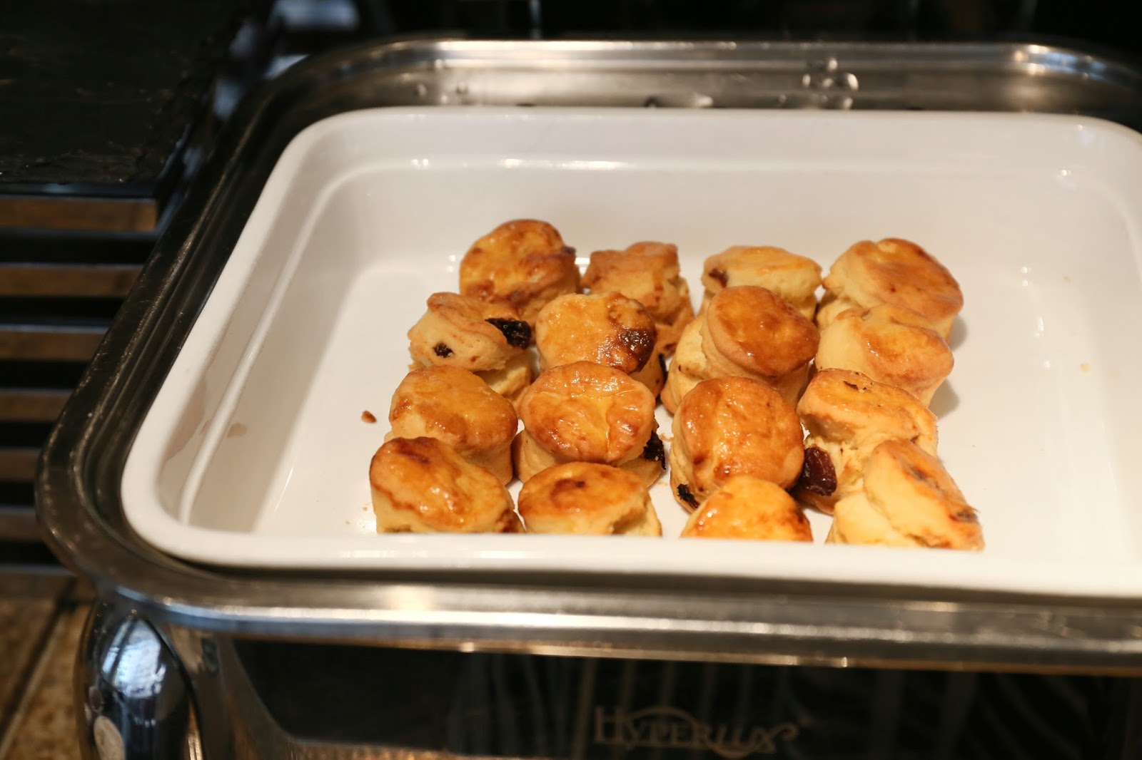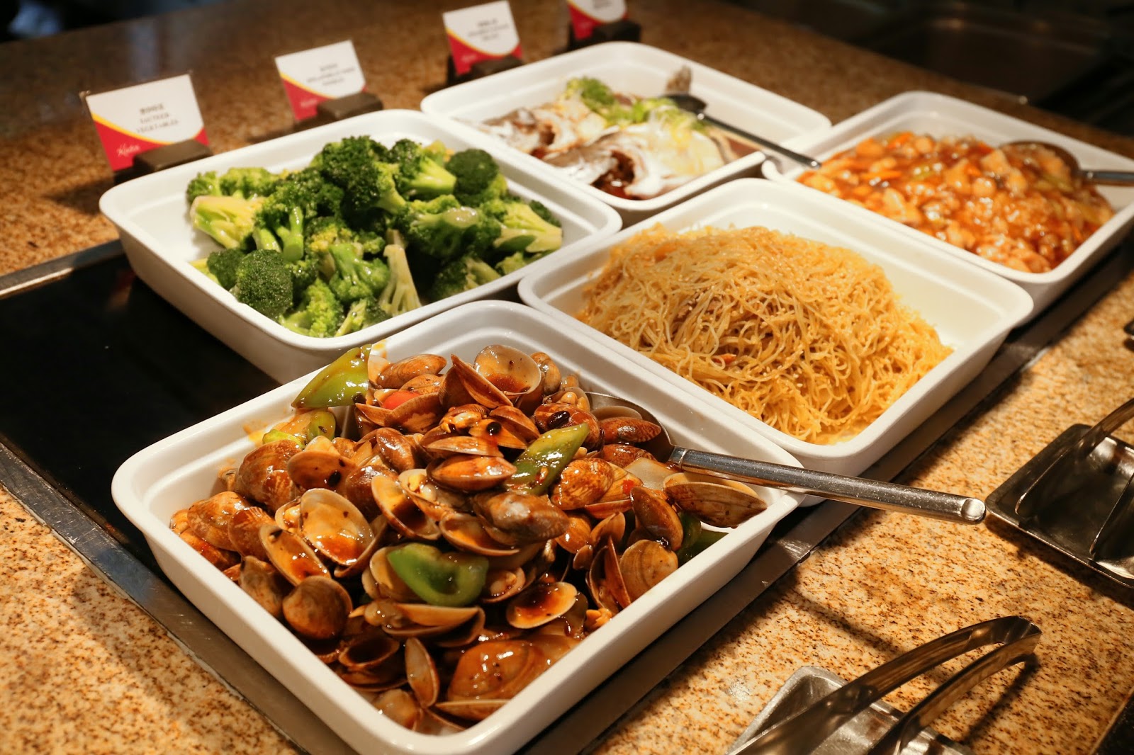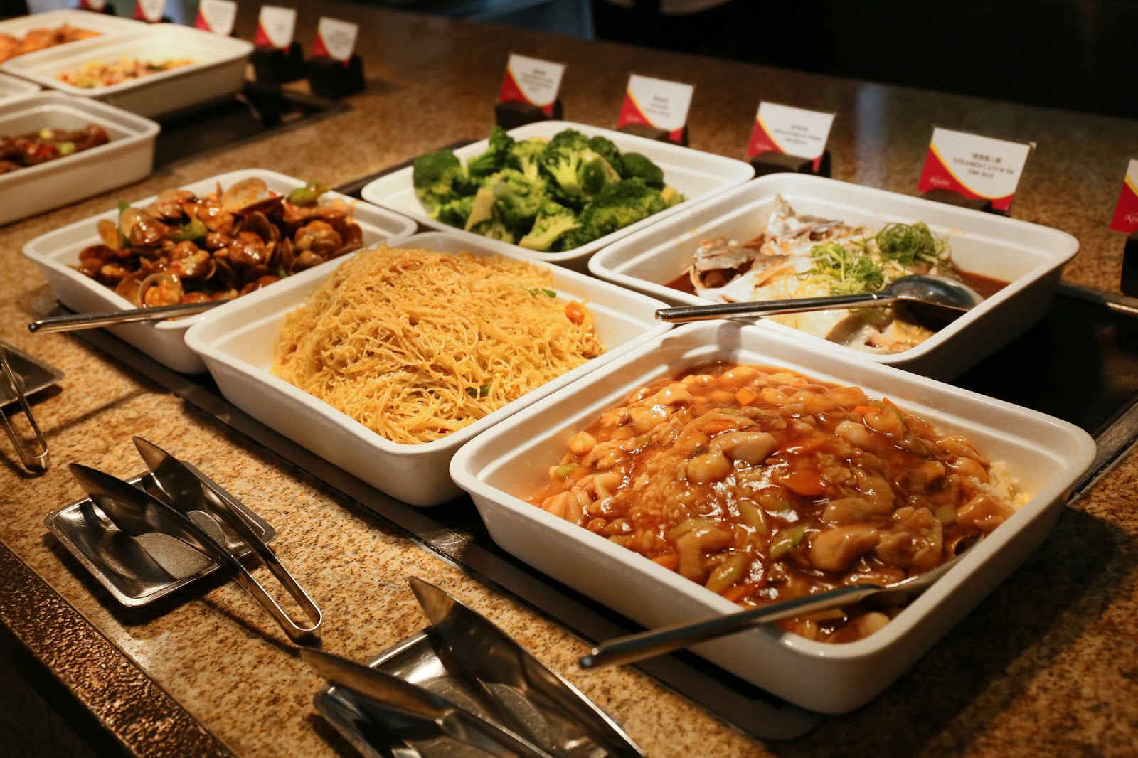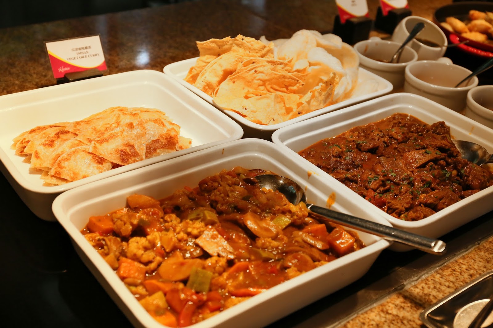 熱盤選擇更是多不勝數:薄餅、烤鱸魚、天婦羅、燒雞粒、烤羊架、燒雞翼、酸忌廉焗薯、芝士腸卡邦尼意大利麵、黑椒牛仔骨、炸蝦片、印度薄餅、咖哩牛、咖哩雜菜、沙爹串燒、西蘭花、豉椒炒蜆、星洲炒米、福建炒飯、清蒸海上鮮,等等,分分鐘比不少 buffet 的晚市更豐富!特別一提,這裡晚市是半自助形式,故下午茶反而可一次過試到更多款式~