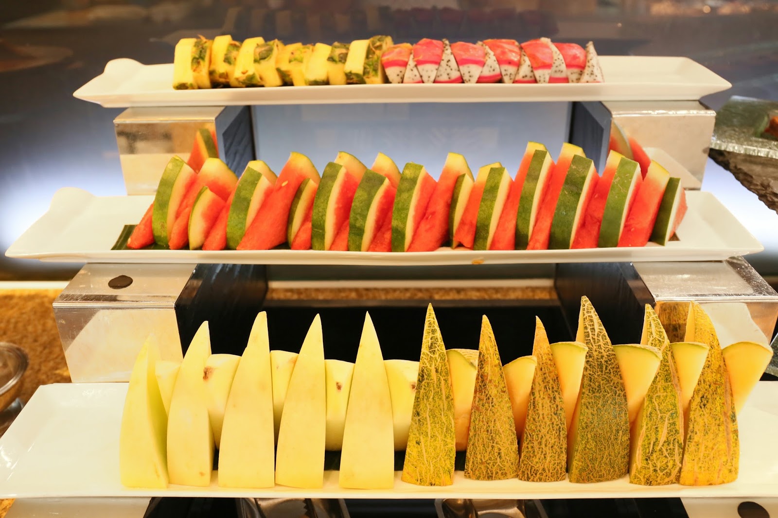 水果也與晚市相約:新鮮火龍果、菠蘿、西瓜、哈蜜瓜、蜜瓜,都已切好方便進食,其中清甜軟熟的蜜瓜最得我們歡心,餐前餐後都吃了超多啊!