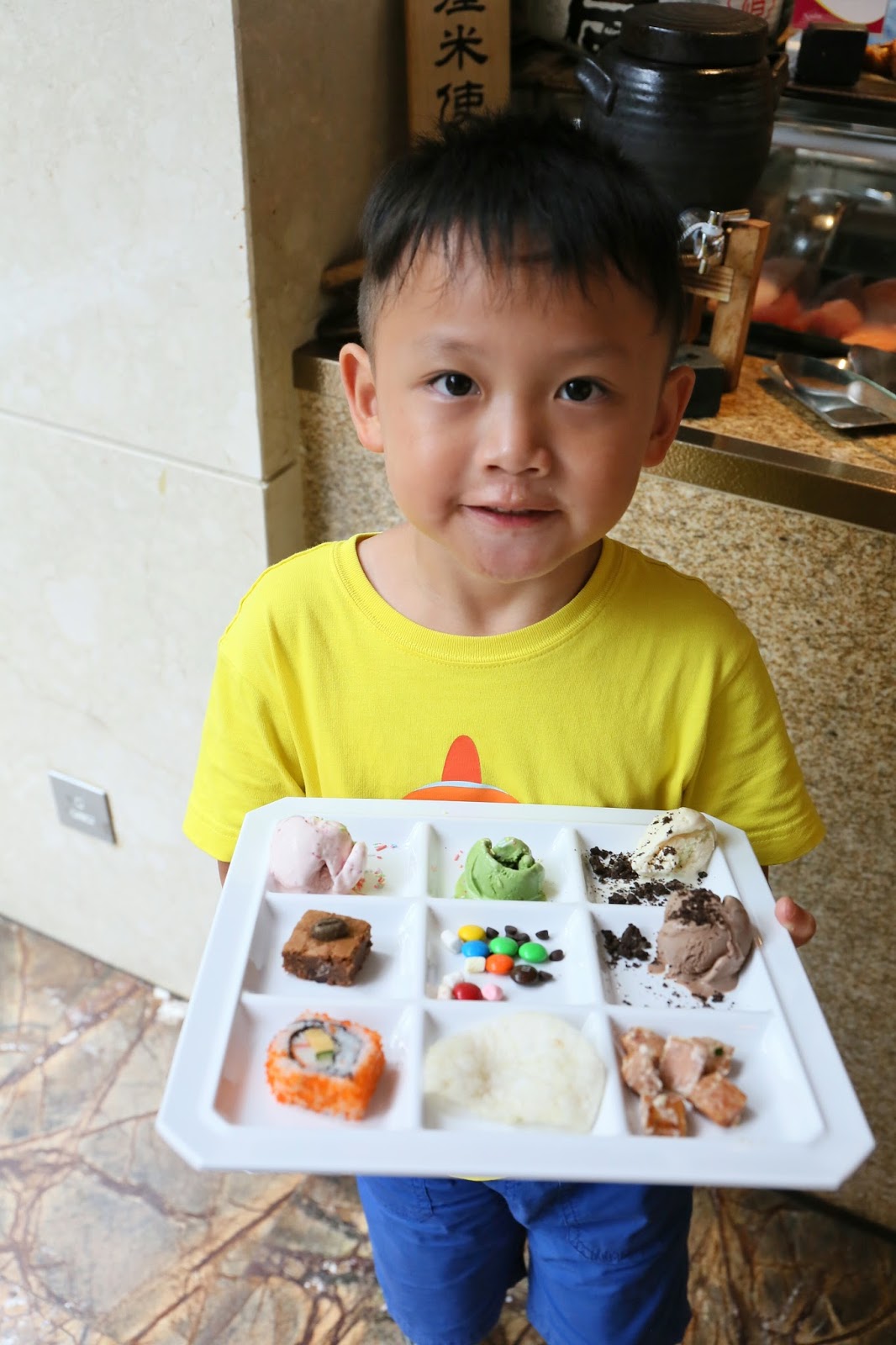 只顧寫Chloe,別忘了小男神Matthew啊!他也吃到差不多飽,要進入甜品環節,就由媽媽陪同取了不同款的雪糕、朱古力粒、蝦片及單件壽司,大大滿足!