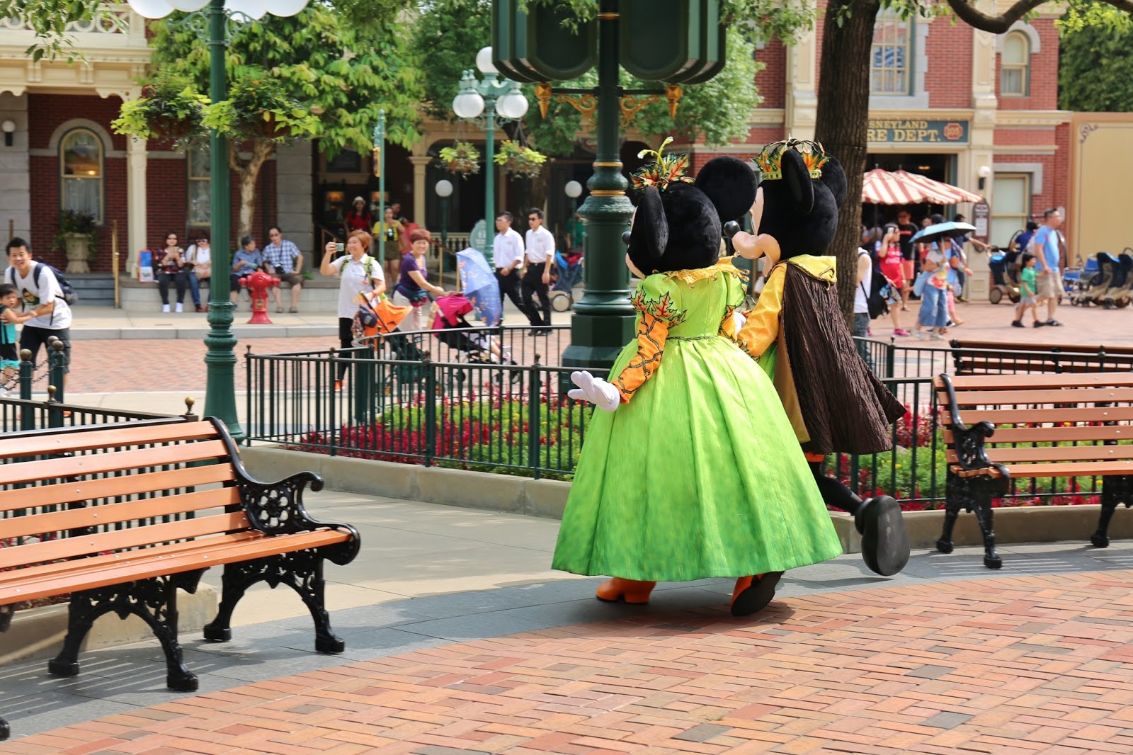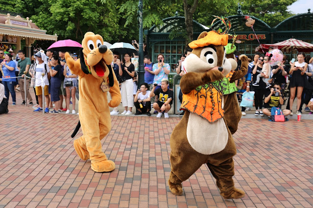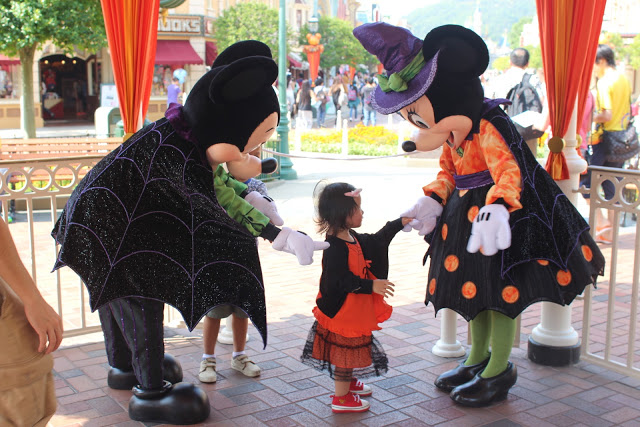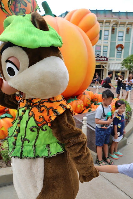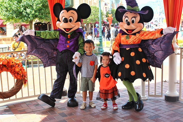 我們抵達樂園時約3點,小兄妹正好睡醒。再過15分鐘就會開始「米奇Halloween大街騷」,因此全部萬聖節服飾的米奇、米妮、Chip & Dale 也要先行離場;媽媽隨手亂拍,卻拍到小兄妹與花栗鼠的合照,好巧呢~