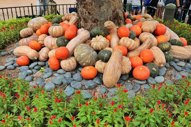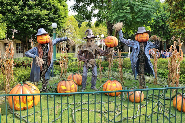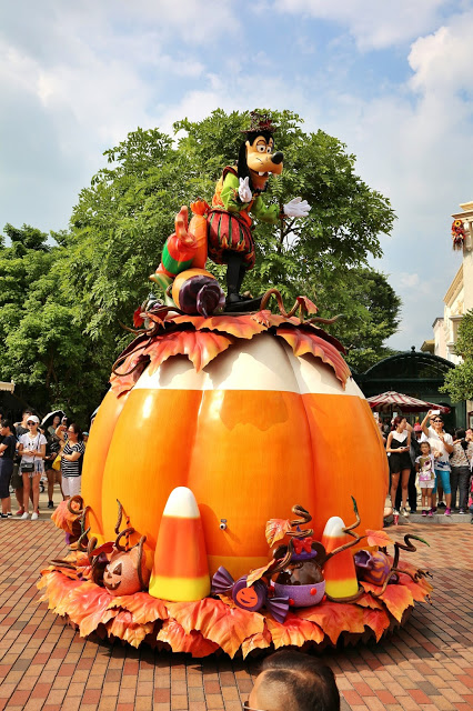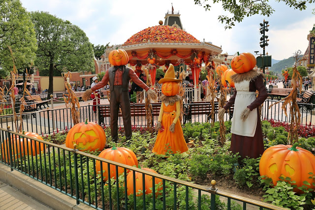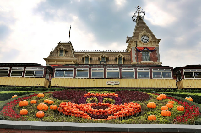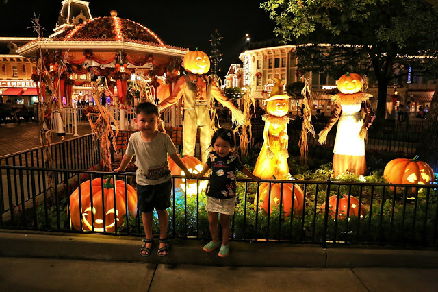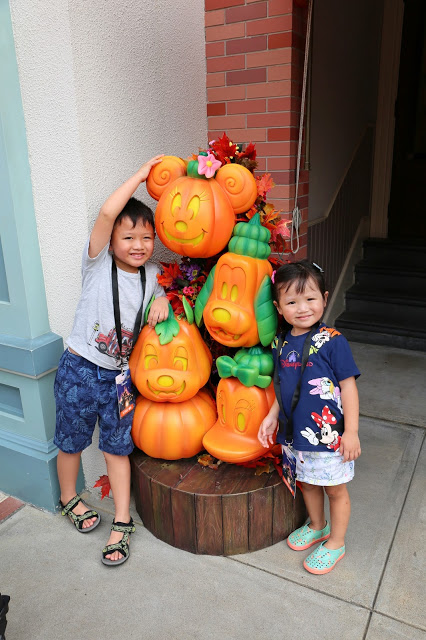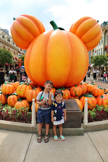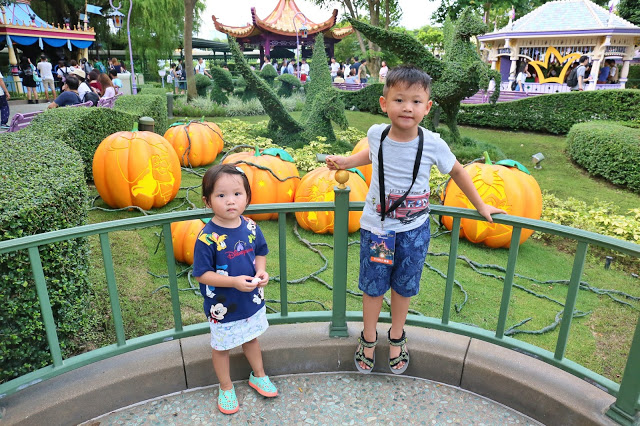 這天小兄妹放學回家更衣、吃飯並完成功課後,我們就動手出發去迪士尼。闊別三個月,一進到入口,已經見到大量的南瓜佈置,加上天氣的密雲,雖是白天仍然有點詭秘呢!