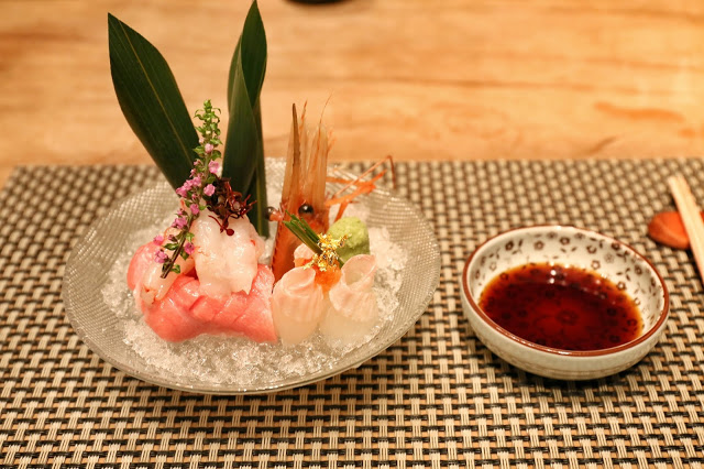 另外還吃了精緻刺身併盤,內容包括新鮮爽口的左口魚、鮮甜軟糯的特大甜蝦,以及油分豐富、幾乎入口即融的拖羅,拌以幽香紫蘇花,吃下去每啖都是幸福鮮味!