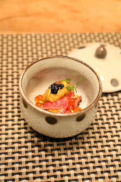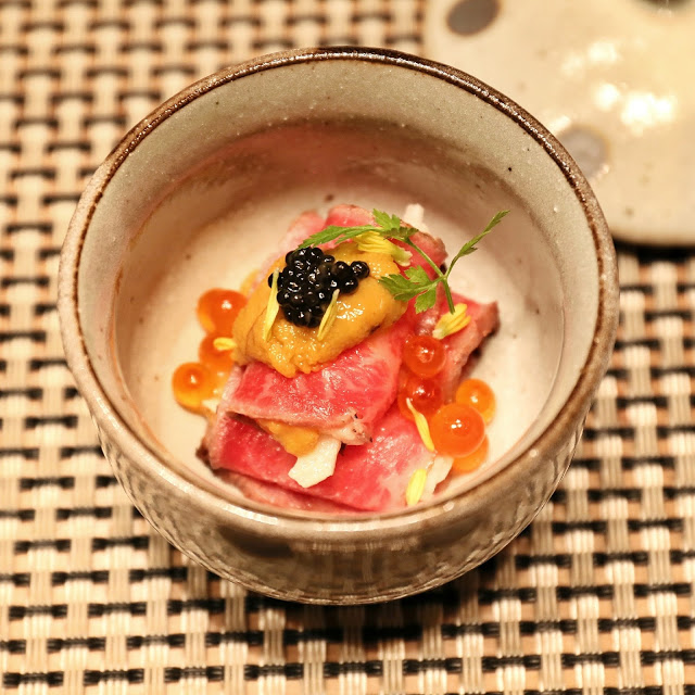 然後是美絕讚絕的 煙燻半熟牛肉伴海膽醋物 Smoked Seared Beef and Sea Urchin with Vinegar,盅物打開輕煙徐徐,我反應慢拍不到,但那香氣就留在心中;而鮮甜海膽、黑魚子及三文魚籽,與卷著淮山絲的半熟宮崎和牛的組合,實在是鮮、滑、嫩的極致,太美味了!