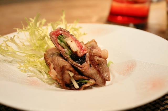 然後是 宮崎和牛卷 Japanese Eggplant in Miyazaki Wagyu Beef Roll,別給名字騙到,卷中並沒茄子,而是昆布、淮山、蔥絲等;由橫切面可見牛肉卷外金黃焦香、內嫣紅粉嫩,配上蔬菜滋味更上一層樓,印象中我一分鐘已經 K.O. 全份三條!
