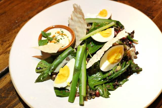 打頭陣是 Super Food Spinach Salad ($128),特別打燈拍照讓大家看清楚內容,包括:雞蛋、藜麥、黑米、蘭度豆、BB菠菜、露筍、紅根菜、石榴、種子等高纖健康食材,吃來很有口感,特別欣賞拌上混和 Tabasco 的乳酪醬,微辣滋味非常醒胃,石榴果的酸甜也是亮點。