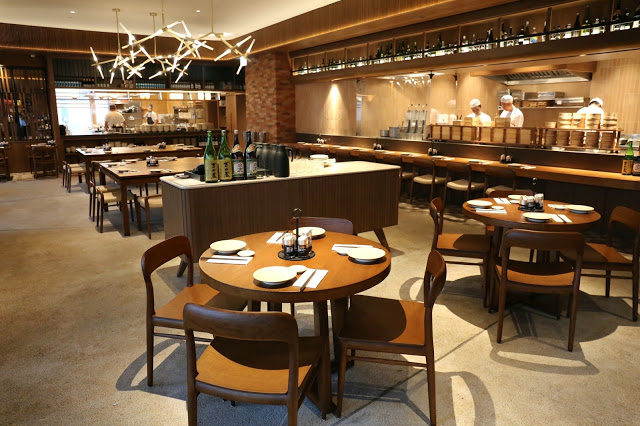 我們不夠6時就入座了,可以拍下店內清靜的一面;由照片可見,日本清酒加上中式的點心籠,這裡沒錯是主打中日混合菜,餐牌也分為:點心、小肴 (Japas)、壽司刺身、卷物、飯麵及甜品幾大項。