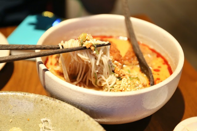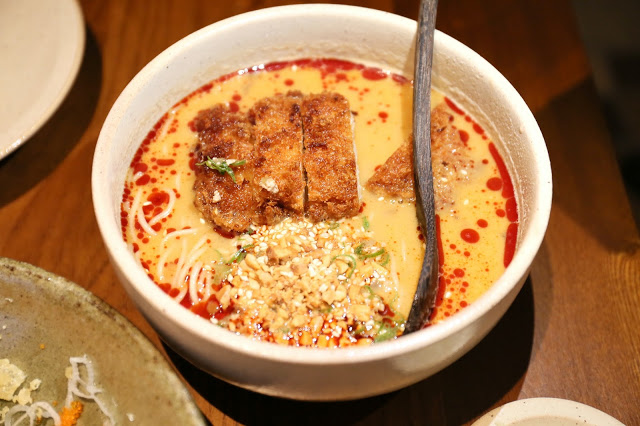 這晚老公食力驚人,還點了 千層豬扒擔擔拉麵 Chili Sesame & Peanut Soup Ramen with Minced Pork & Layer Pork Cutlet ($72),辣湯底帶麻又香,不過吃得出有味精,麵身本身就不錯;最有趣是千層豬扒,是由多層薄豬壘成再去香炸,故吸湯能力很高。