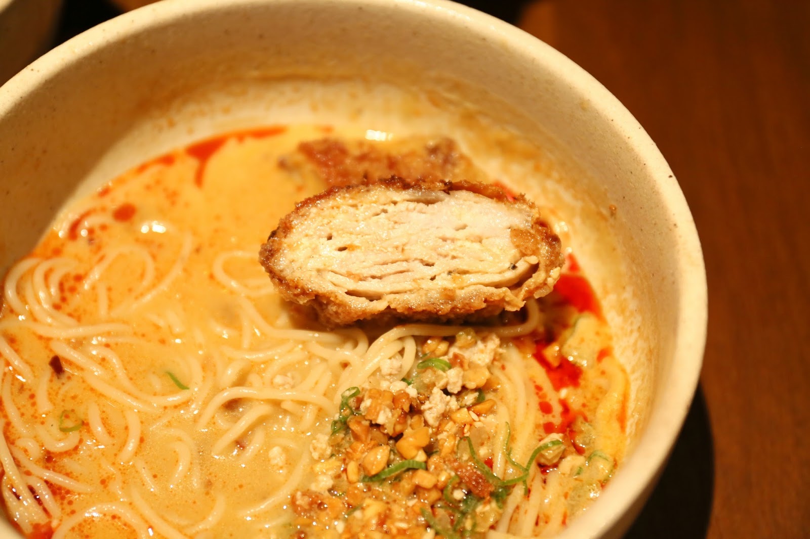 這晚老公食力驚人,還點了 千層豬扒擔擔拉麵 Chili Sesame & Peanut Soup Ramen with Minced Pork & Layer Pork Cutlet ($72),辣湯底帶麻又香,不過吃得出有味精,麵身本身就不錯;最有趣是千層豬扒,是由多層薄豬壘成再去香炸,故吸湯能力很高。
