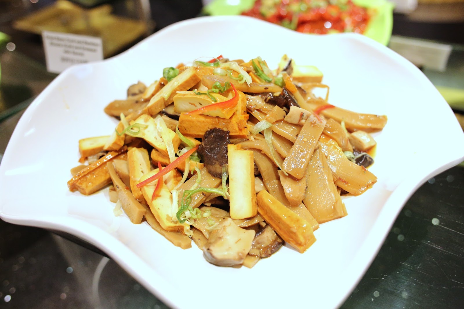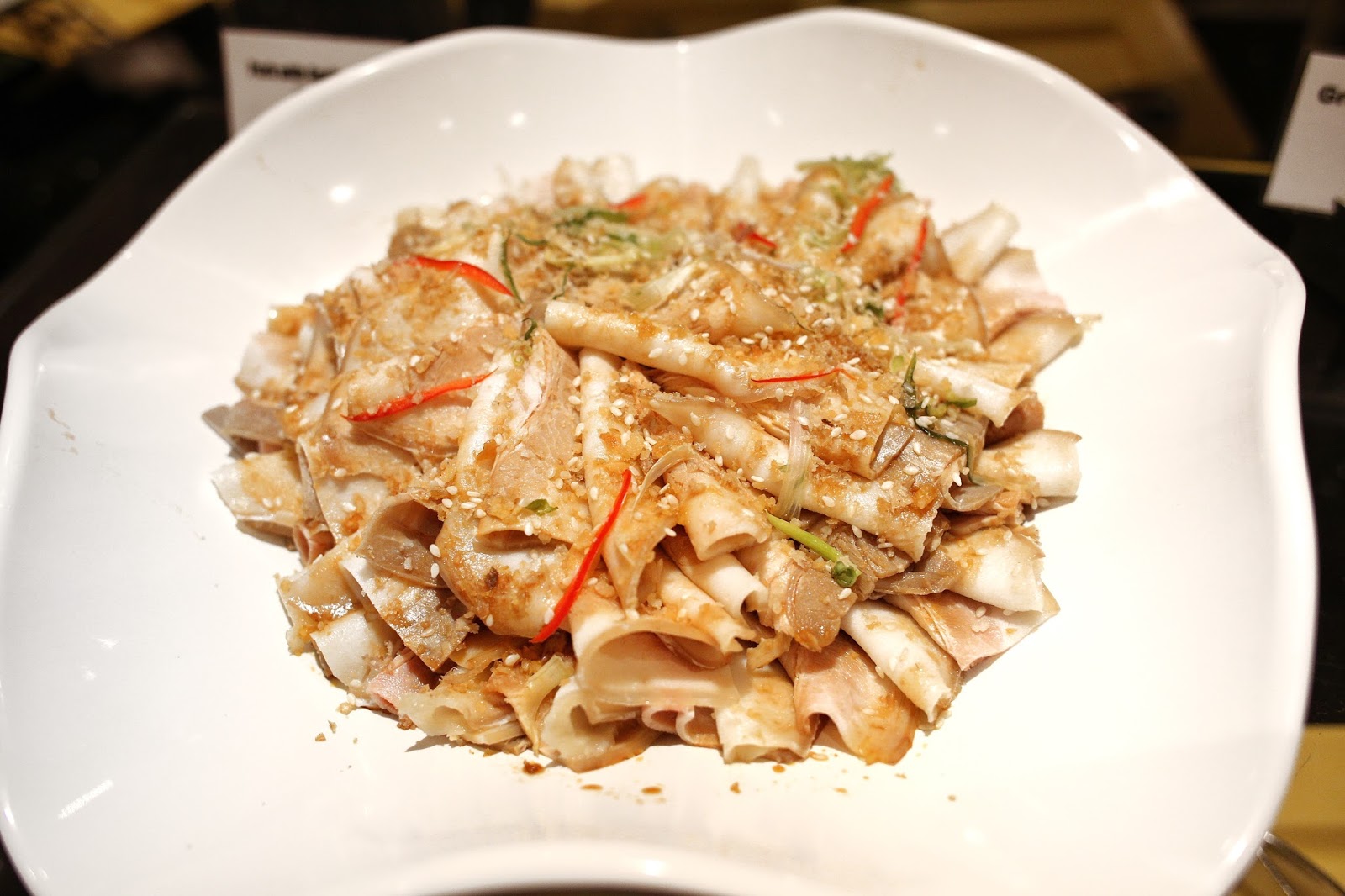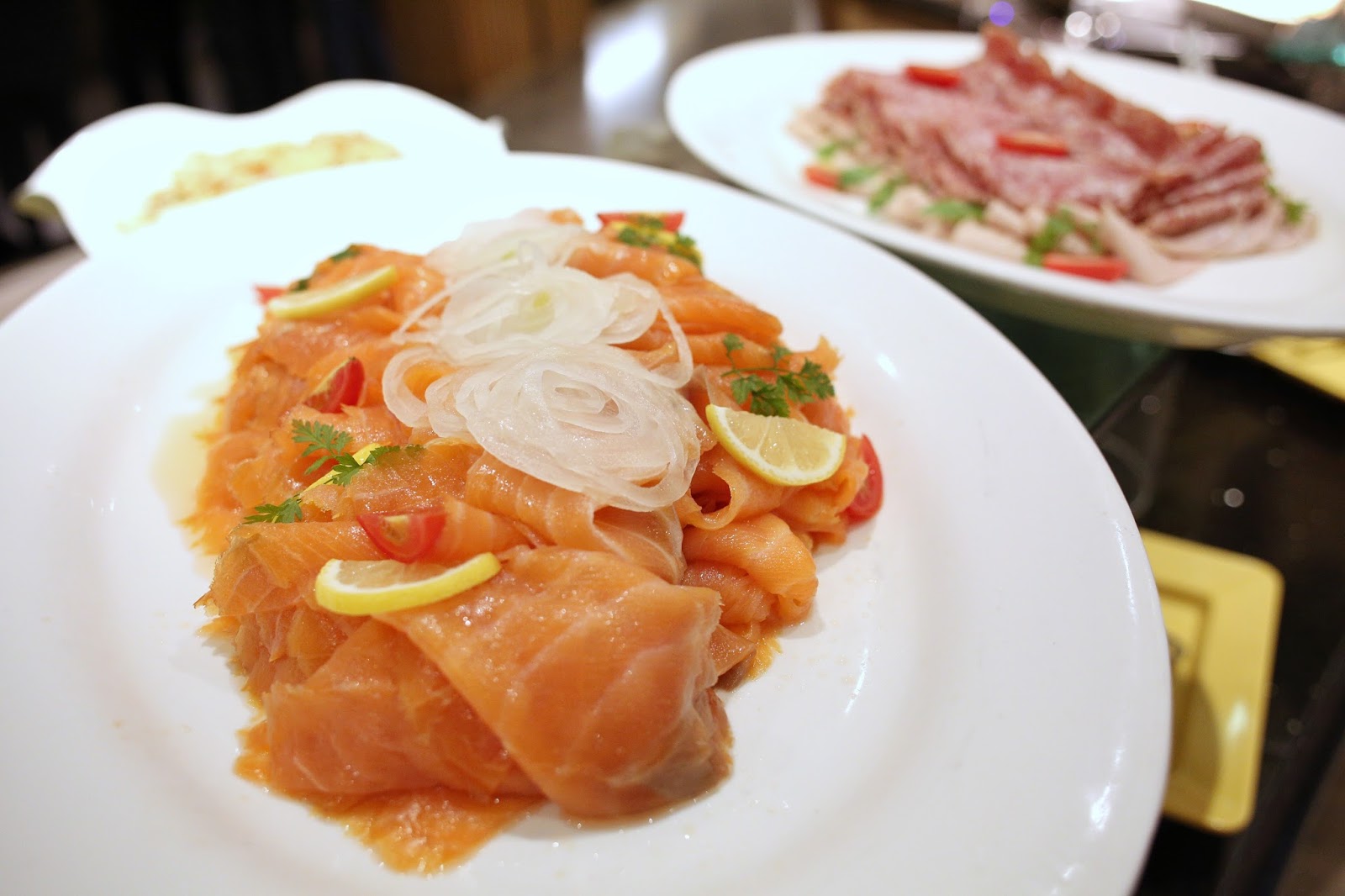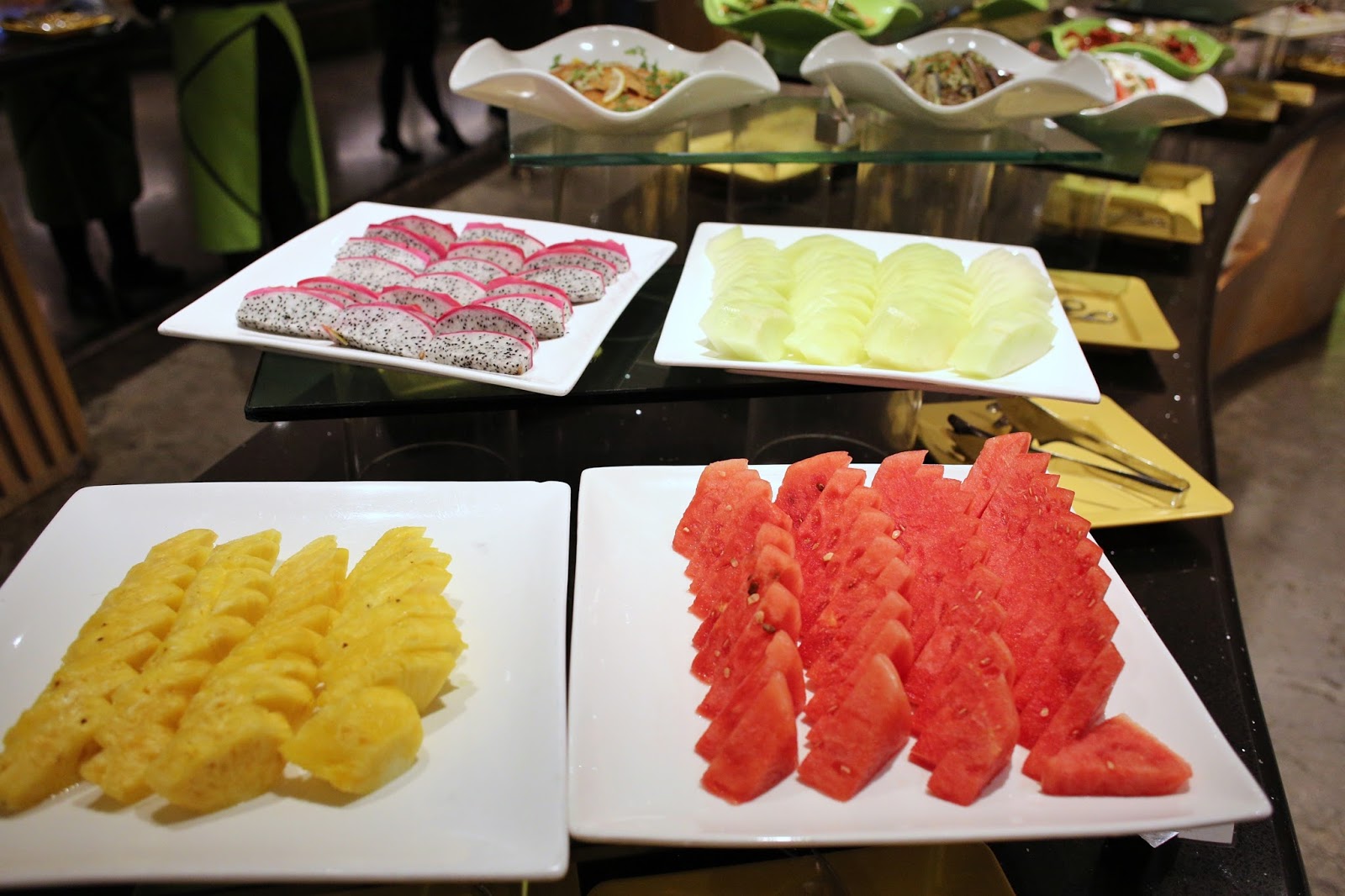 進到食物區,先是切件水果,包括 buffet 打底之寶火龍果、清甜菠蘿、蜜瓜,以及清熱一流的西瓜。之後又有不同的現成沙律及冷盤,如:煙鯖魚柳、茄子沙律、海鮮沙律、涼拌豆干竹筍、扒雜菜沙律...
