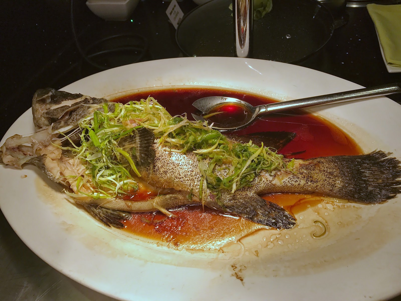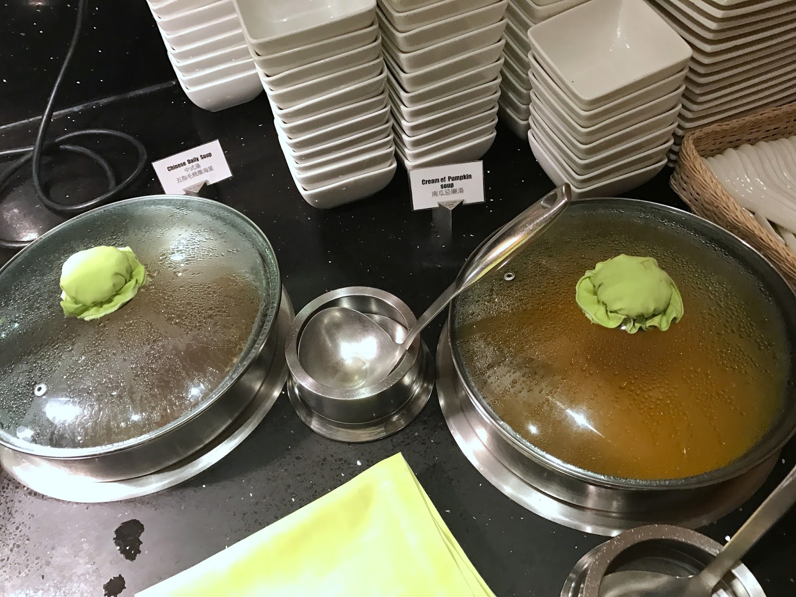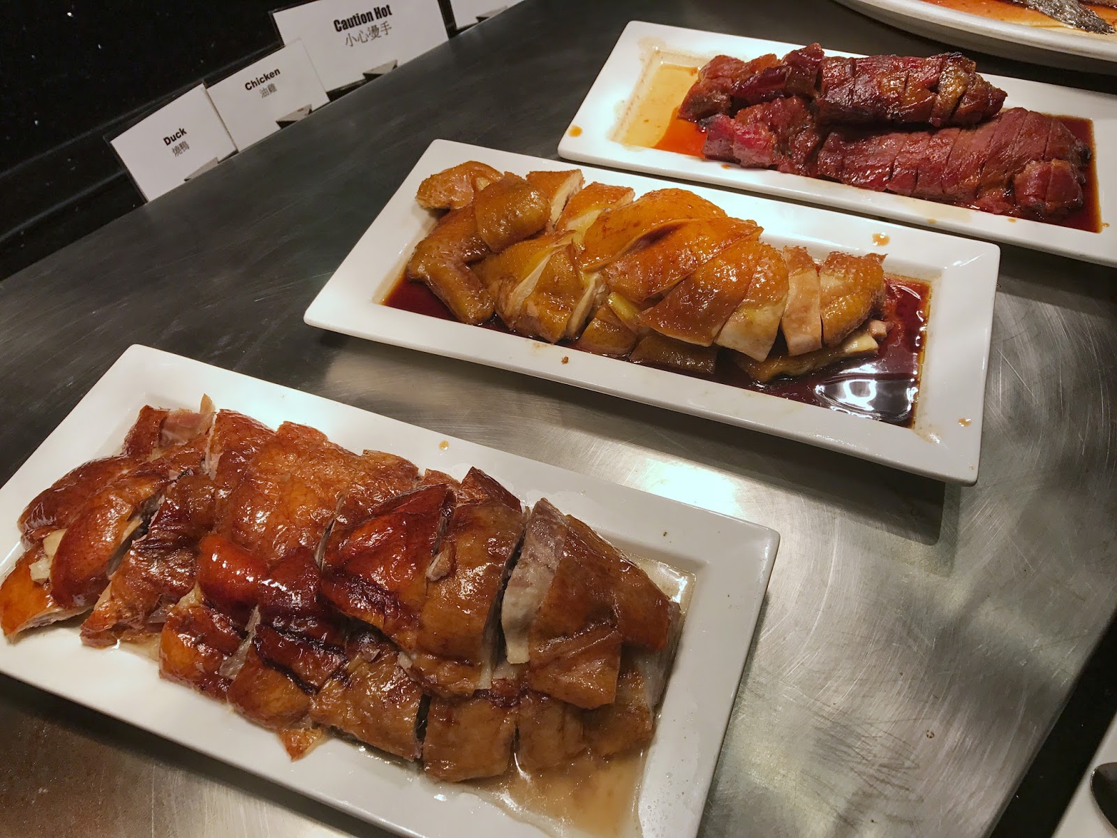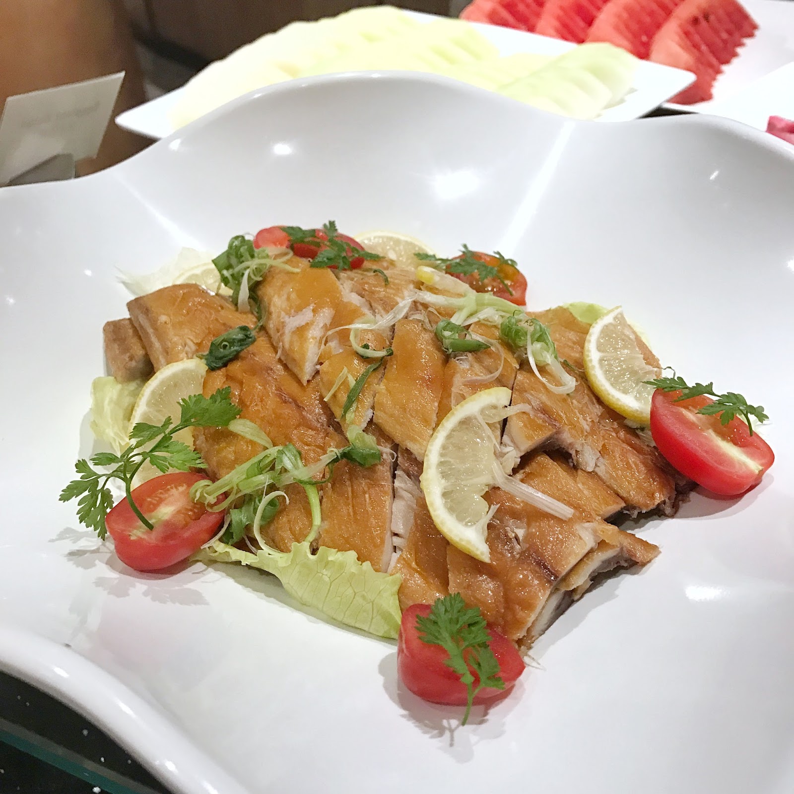 沙律吧隔壁有三款燒味:燒鵝、油雞、叉燒,水準都不錯的;同行又有清蒸大海斑,以及一中一西的五指毛桃燉海星、南瓜忌廉湯等。