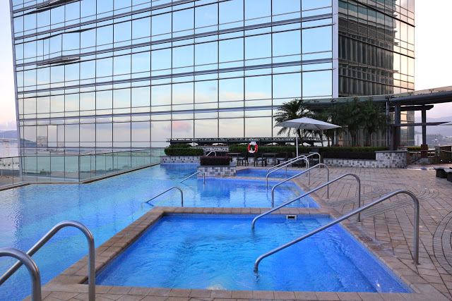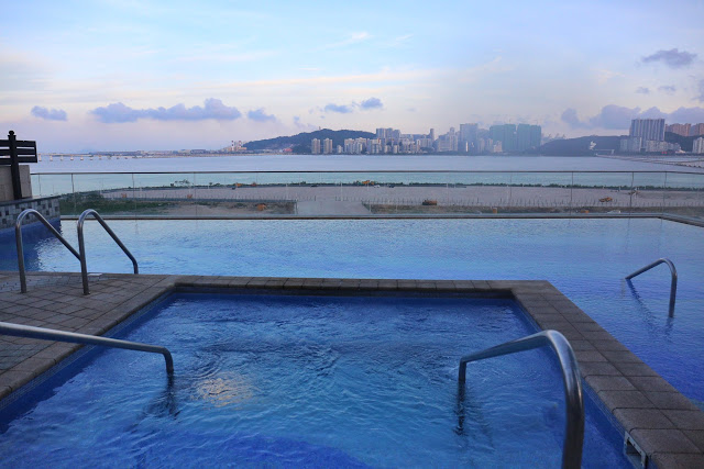 而在晚餐前,甜魔媽媽也趁好天色去了泳池八卦;雖然新泳池不及舊址的大,但 Infinity Pool 的設計有海天一色的效果,景色非常優美,又設兩個 Jacuzzi,真可惜沒帶泳衣來啊!