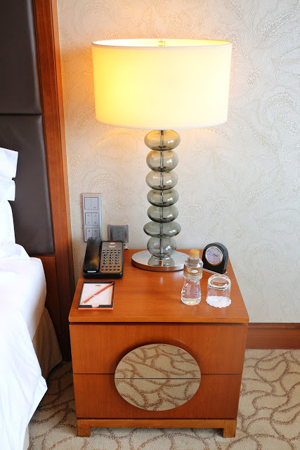 兩邊床頭櫃都細心備有支裝水,同時也有筆記、鬧鐘、房燈及窗簾開關等掣,以及充電服務。