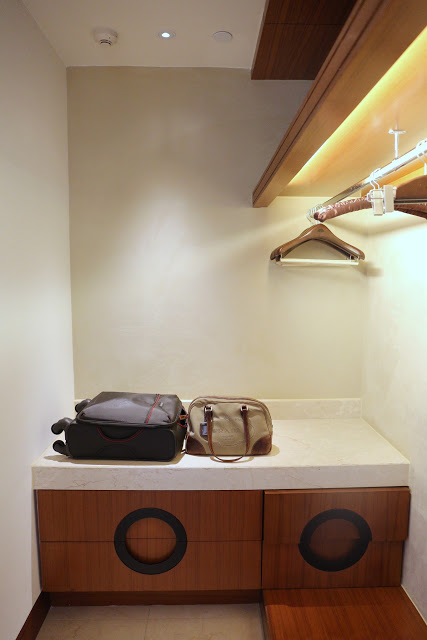 偌大的開放式衣櫃下,酒店人員早將行李置放好,我也放下置放相機的大手袋,肩膊當堂一身鬆!如有需要也可將證件及財物置放在隱藏式夾萬中,不過留宿文華,我都很放心,這次沒有使用。