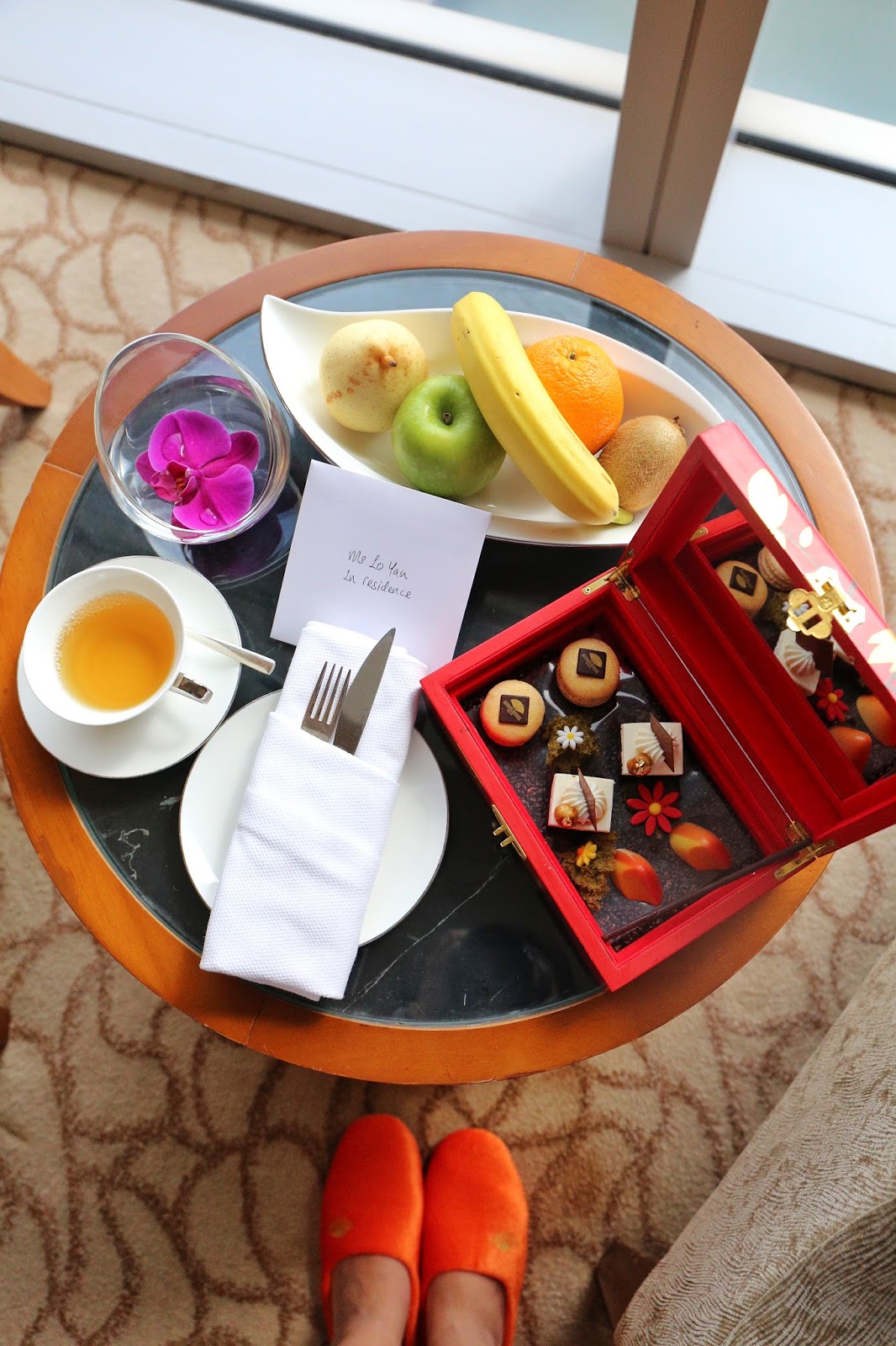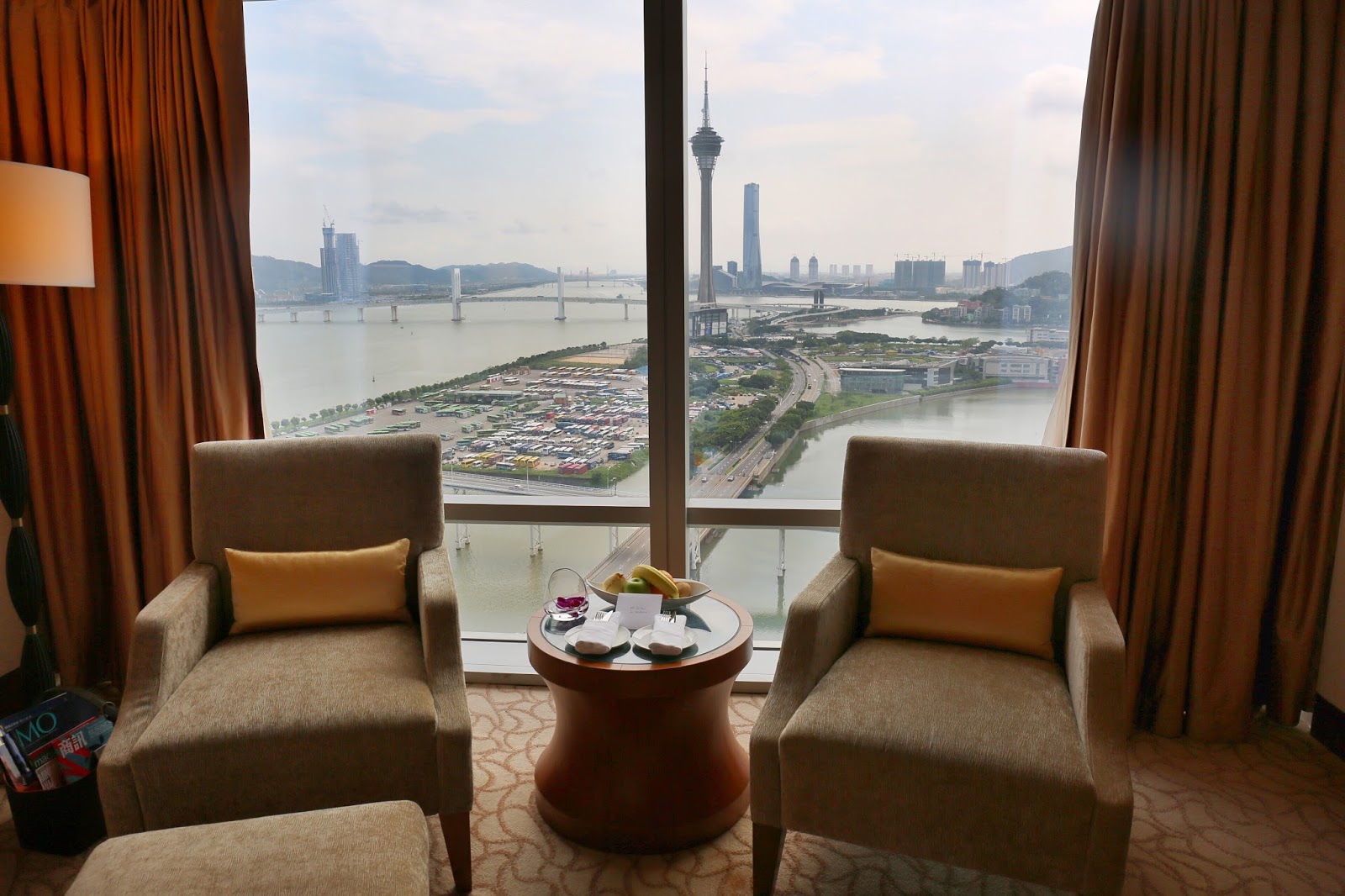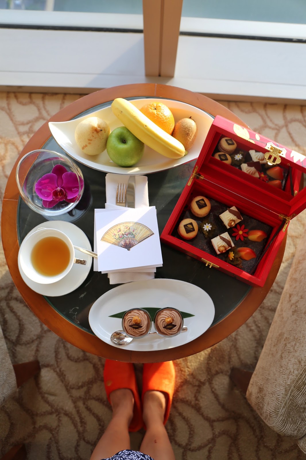 而最令人賞心悅目的,當然是連同澳門塔的超優美湖景!在這美麗的景色之下,還有文華贈送的新鮮水果碟,及以錦盒呈上的馬卡龍、朱古力、甜點併盤,太甜蜜了!