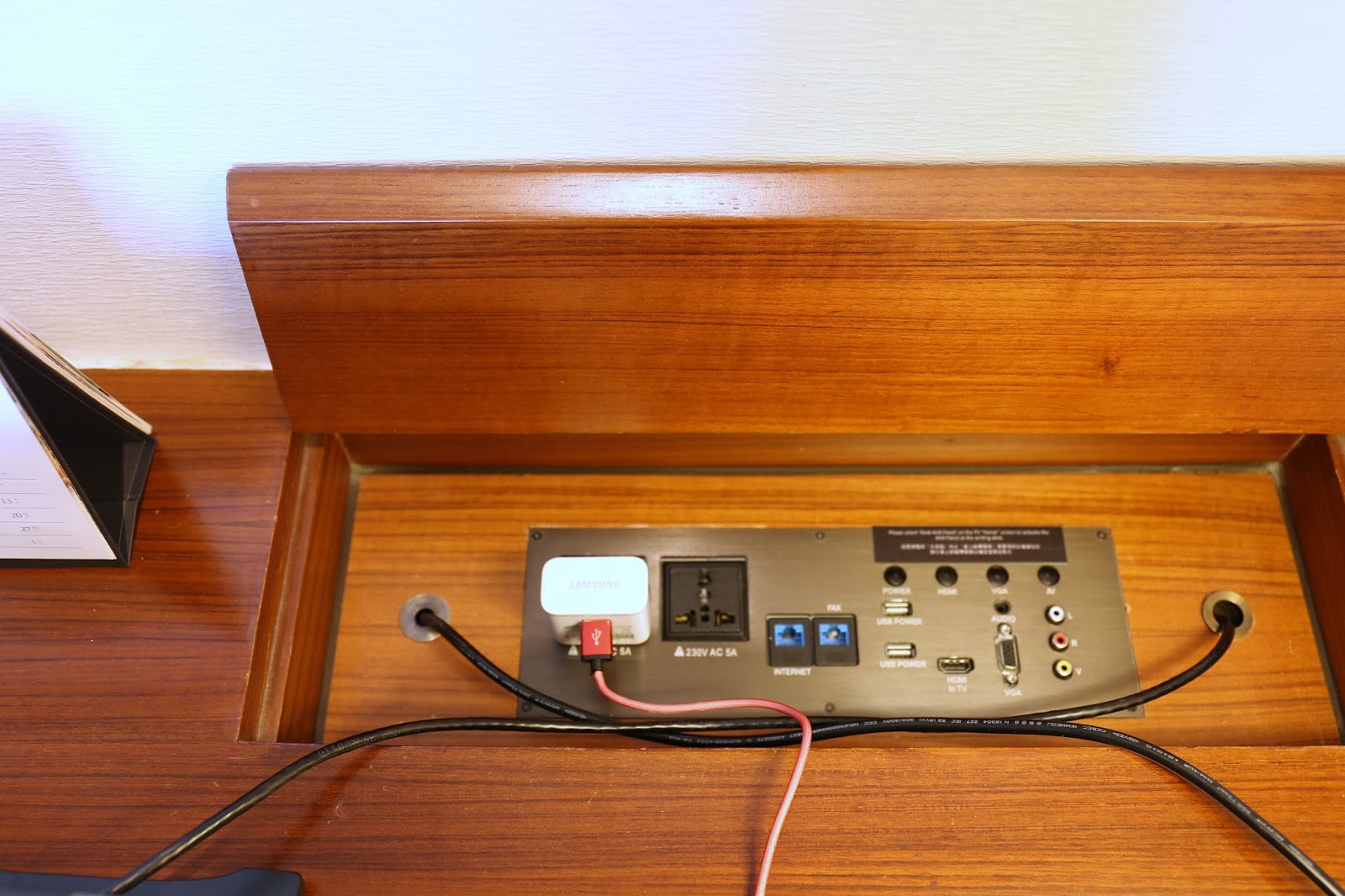 而在書檯那邊,除了月曆、可以接駁專線的電話,又有 USB 直接取電服務(共有兩個位置),非常方便像我這樣的手機高用量群眾。