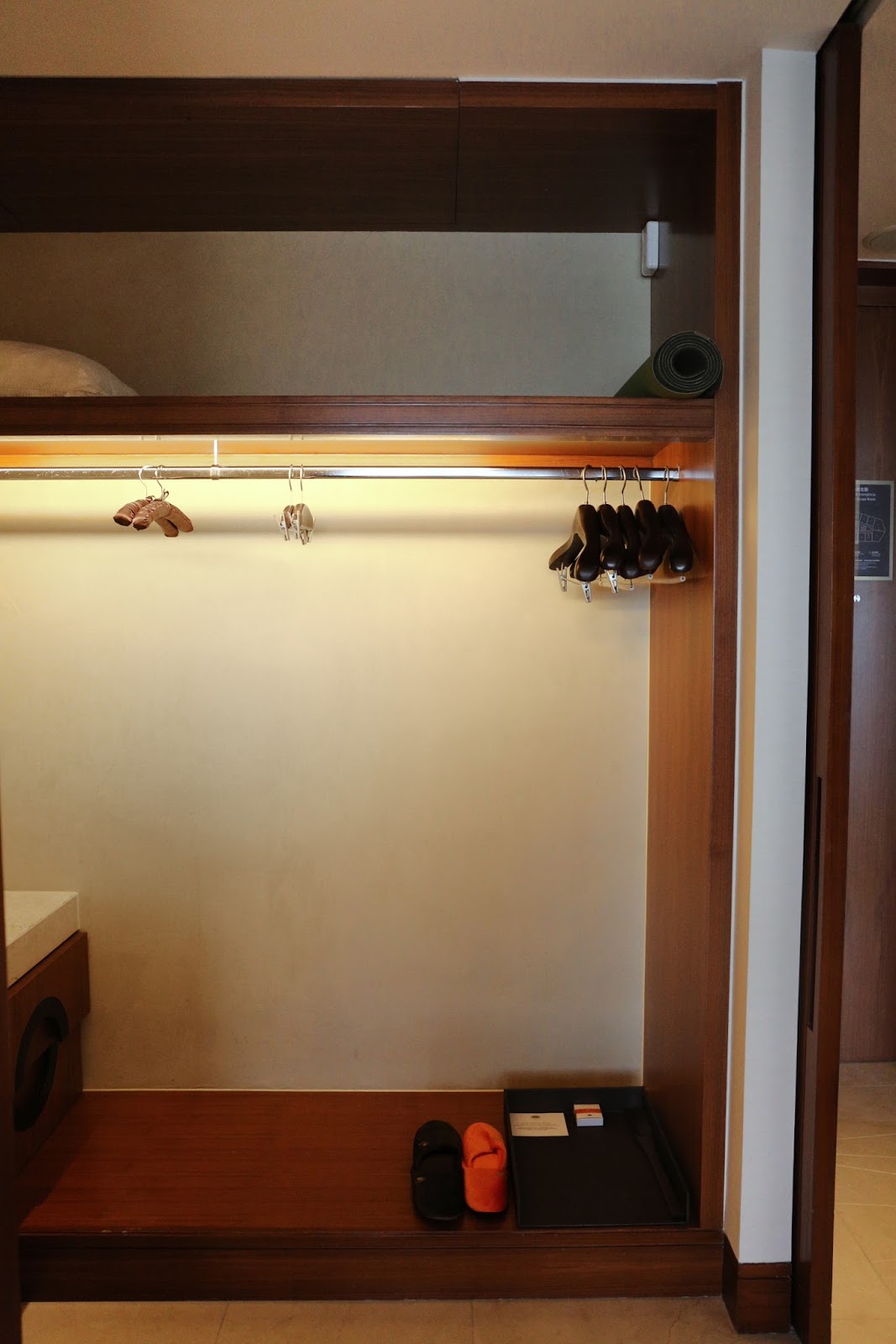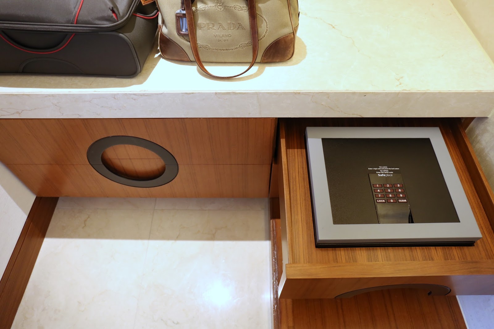 偌大的開放式衣櫃下,酒店人員早將行李置放好,我也放下置放相機的大手袋,肩膊當堂一身鬆!如有需要也可將證件及財物置放在隱藏式夾萬中,不過留宿文華,我都很放心,這次沒有使用。