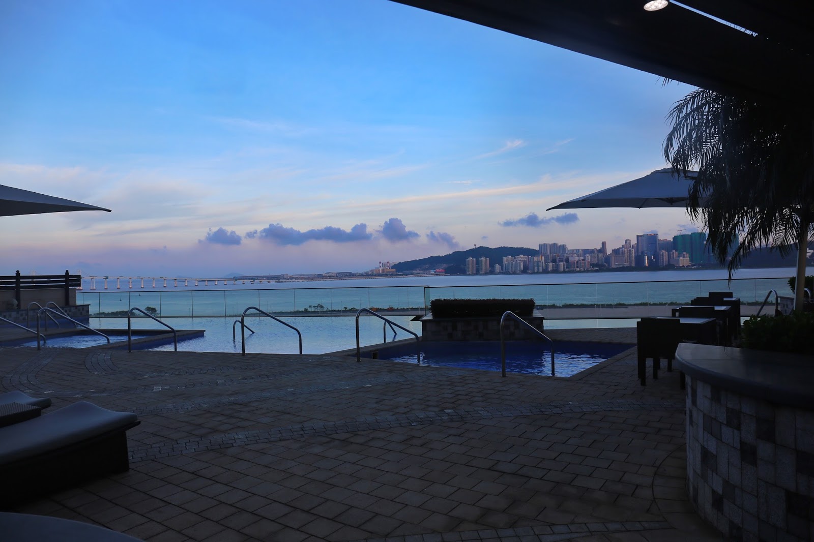 而在晚餐前,甜魔媽媽也趁好天色去了泳池八卦;雖然新泳池不及舊址的大,但 Infinity Pool 的設計有海天一色的效果,景色非常優美,又設兩個 Jacuzzi,真可惜沒帶泳衣來啊!