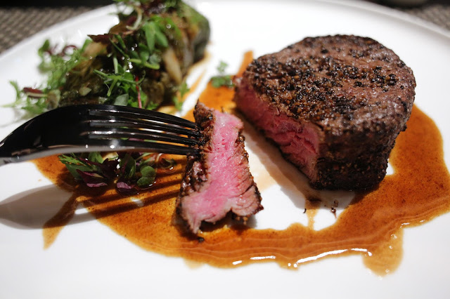 添上紅酒,又來到主菜時間:非常推介 Roasted pigeon “French style” 烤法國乳鴿 ($640),乳鴿烤得皮脆肉嫩甜,同上的青豆、焦糖洋蔥、煙肉等法式配料也合心,更重要是以乳鴿汁及內臟製作的 salmis 醬汁起了畫龍點晴的作用,菜式份量又足,令人吃得甚為滿足!