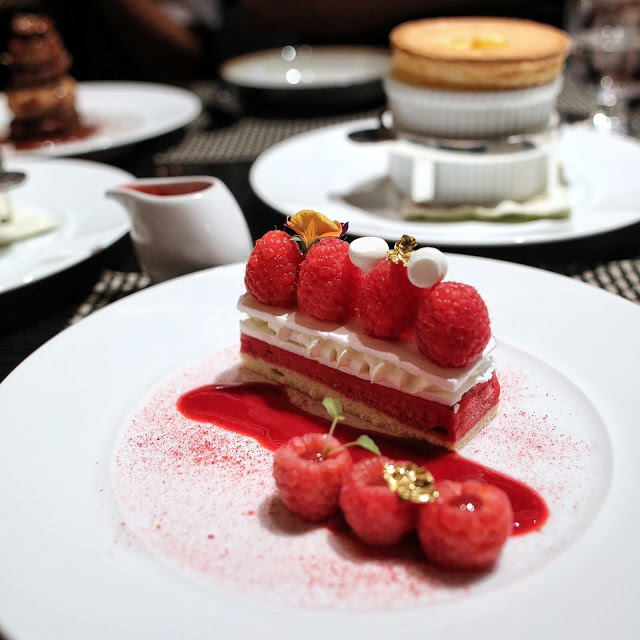 另一款靚絕全場的,是 Raspberry vacherin 紅桑子夾心餅 ($280),以浸透了野士多啤梨糖漿的海綿蛋糕、蛋白餅、及mascarpone青檸味芝士,拌以馬鞭草雪糕,最後淋上暖紅桑子醬,清新而不太甜,不錯的。
