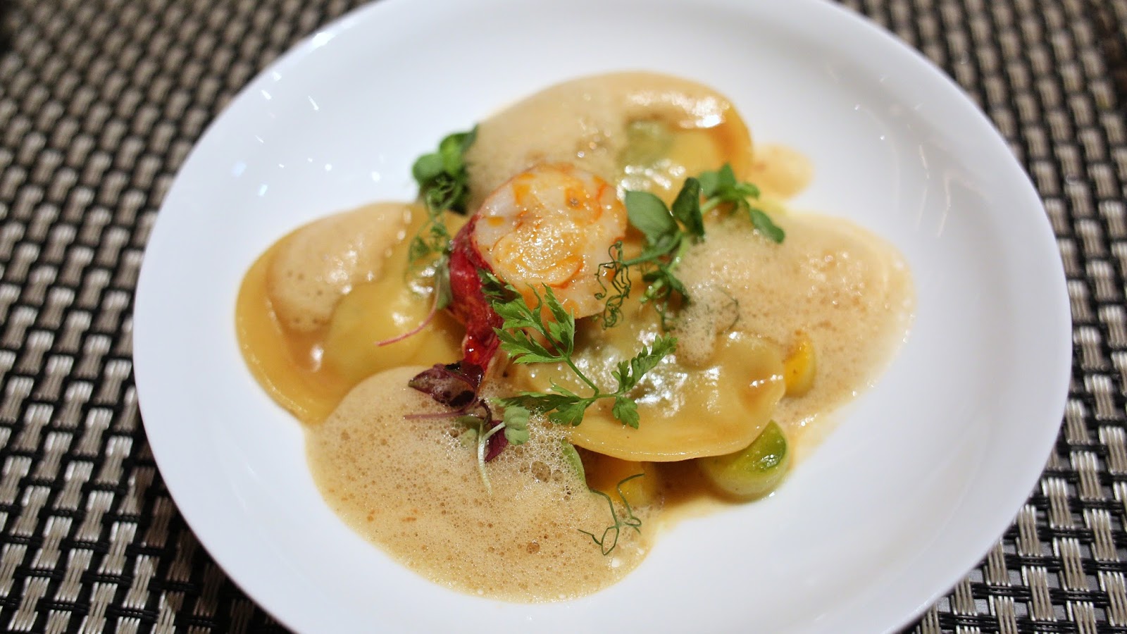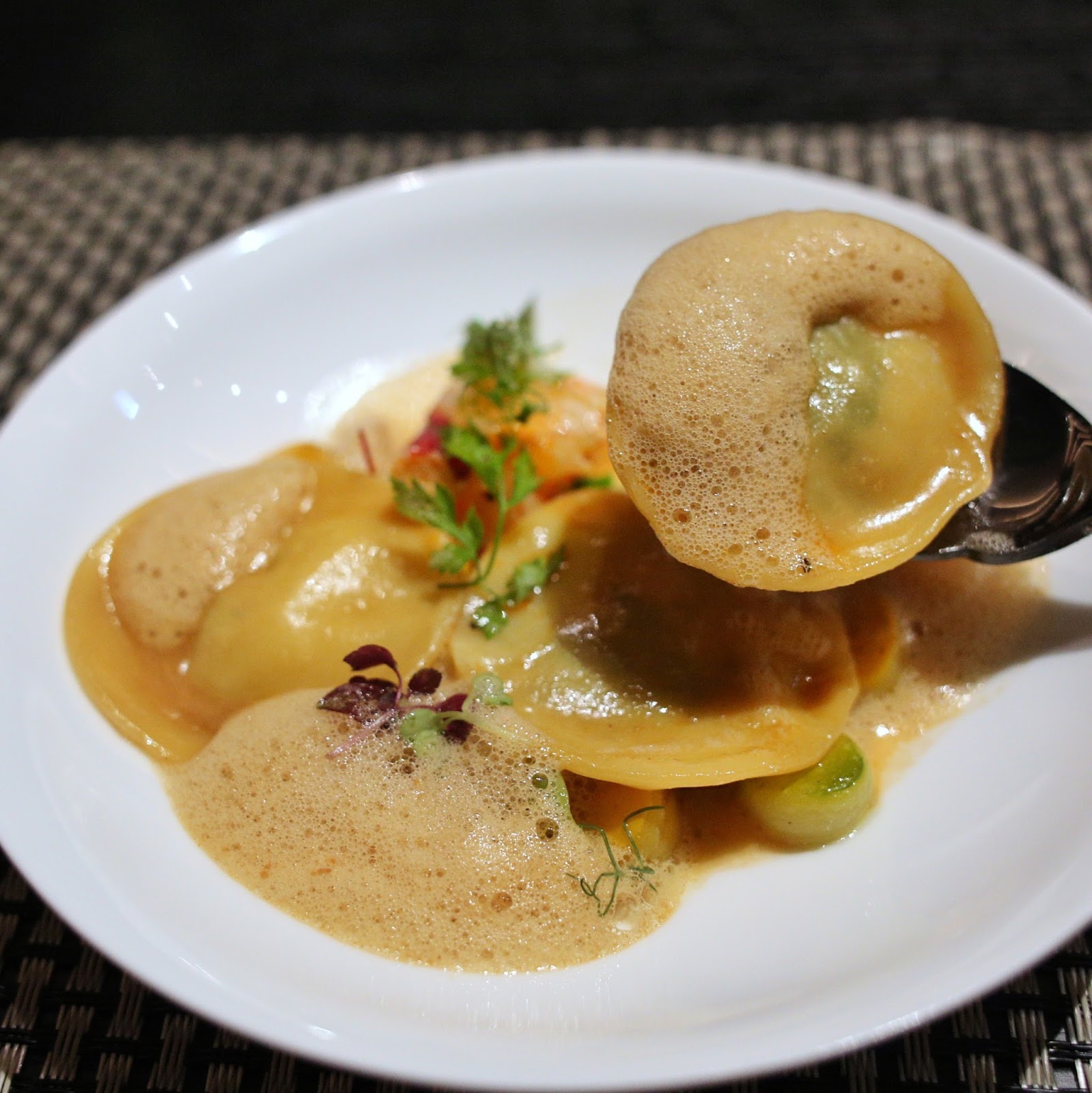 超愛接著這 Blue lobster ravioles printed with herbs 藍龍蝦香草意大利雲吞 ($680),選用自家製小意大利香草皮雲吞,裡而釀有龍蝦肉及軟羊奶芝士,新鮮的出品超滑又嫩!伴以清爽的小南部蔬菜球、龍蝦醬汁以及龍蝦濃湯,每啖都是鮮美、吃完齒頰留香~