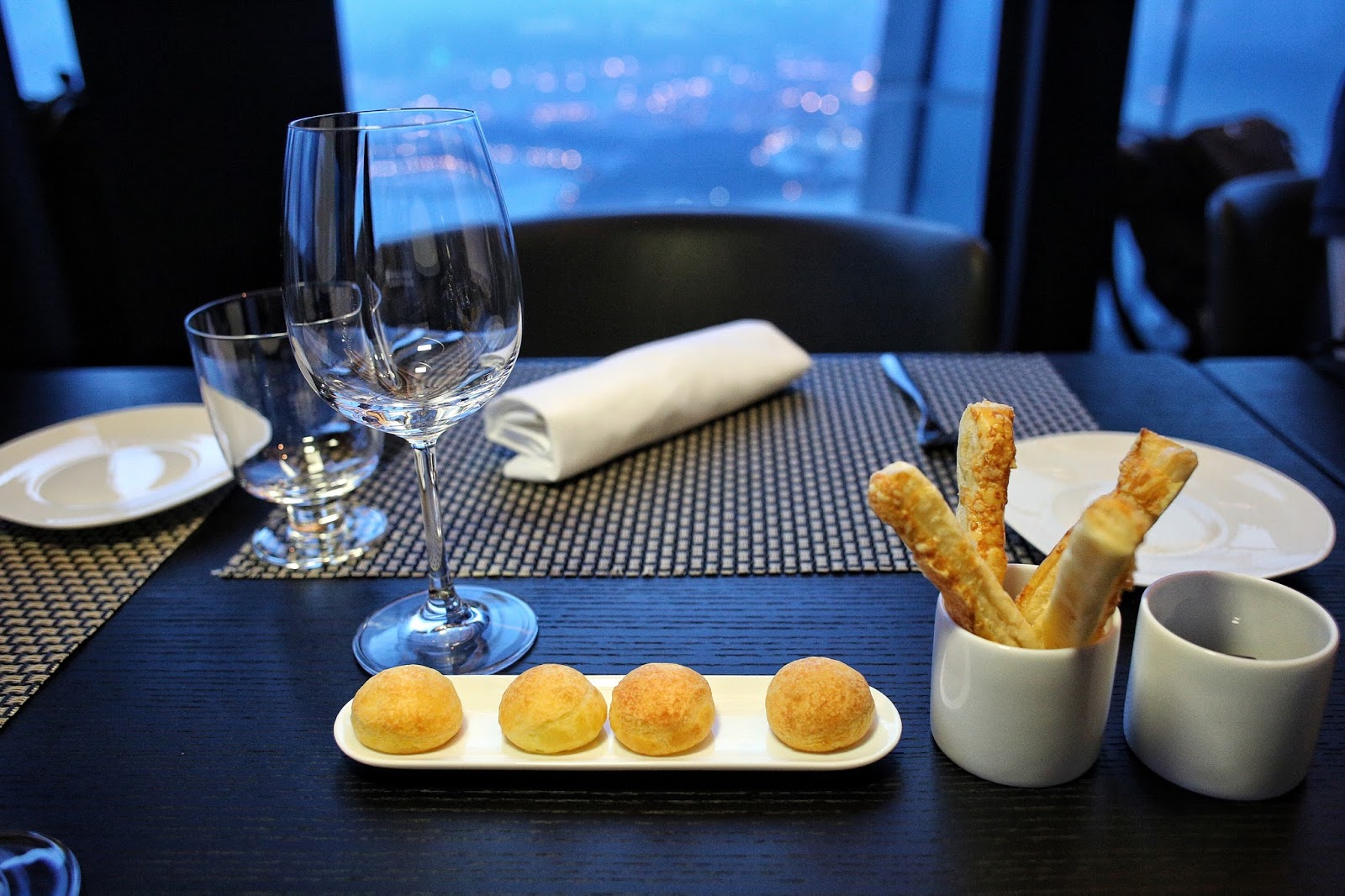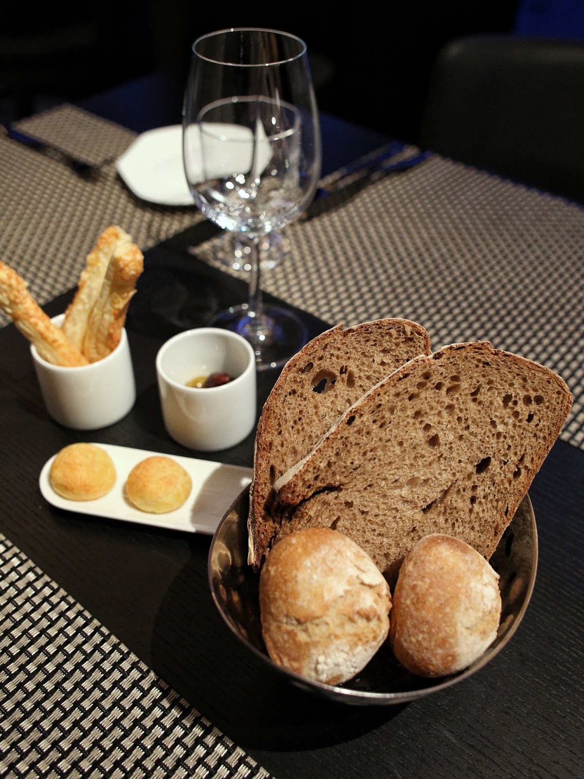 絕美的背景下,芝士泡芙、芝士條及橄欖上檯了~Chef Frédéric Vardon 喜歡簡單直接的菜式,這 amuse bouche 就是例子;雖然簡單,但趁熱吃的泡芙及芝士條都非常可口,好吃程度是後來忍不住要添一輪!麵包籃也無多餘花巧,搽上牛油好吃就夠了。