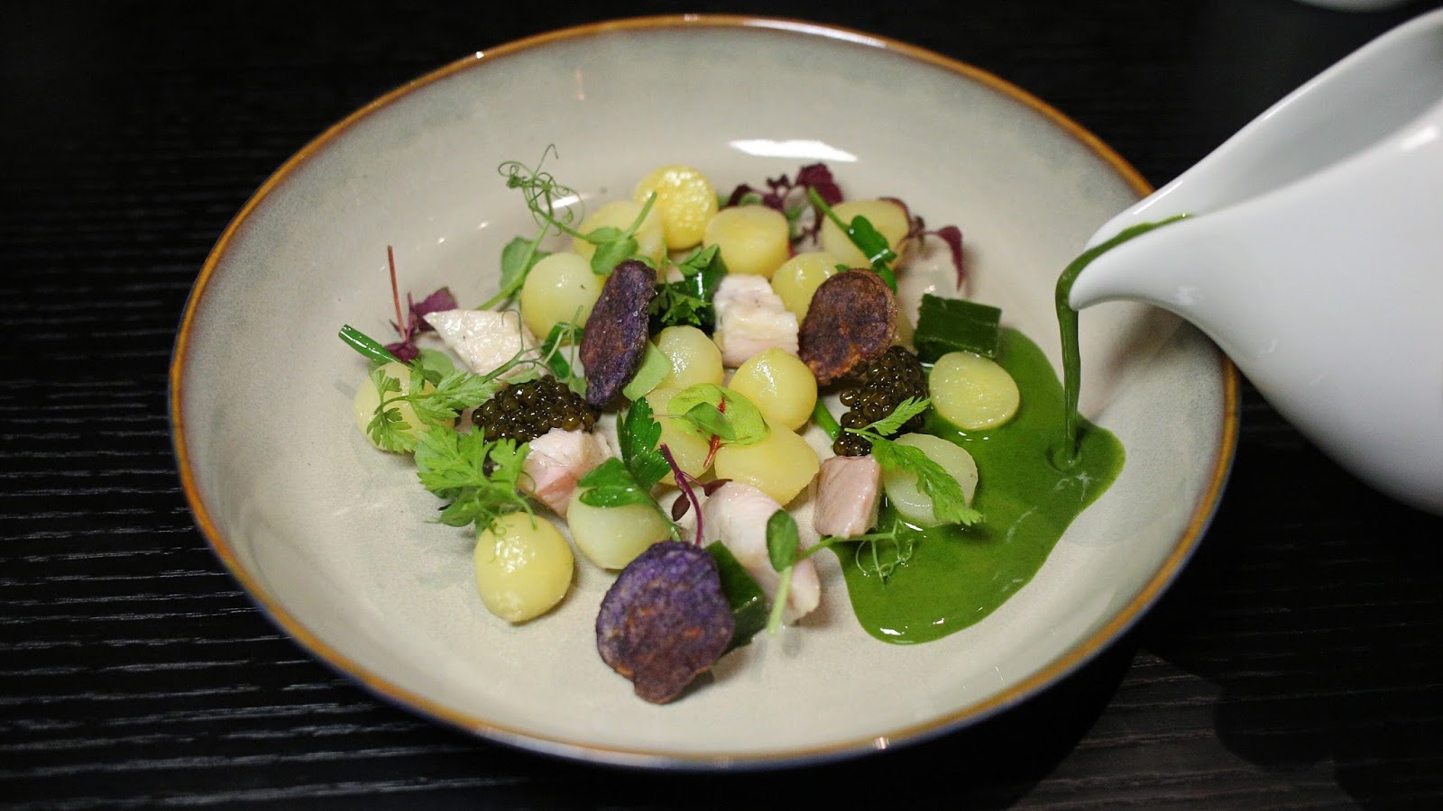 另一款頭盤就選了精緻的 Caviar Kristal Gold - Maison Kaviari 法國黃金水晶 Kaviari魚子醬 ($440),侍者先呈上載有炙鰻魚、咸牛油烤薯仔,矜貴Kaviari魚子醬以及罕見紫馬鈴薯片的碟,再澆以魚湯、白蘑菇及蕁麻茸的香濃熱湯,多重滋味口感繽紛又豐富,觸動味蕾!