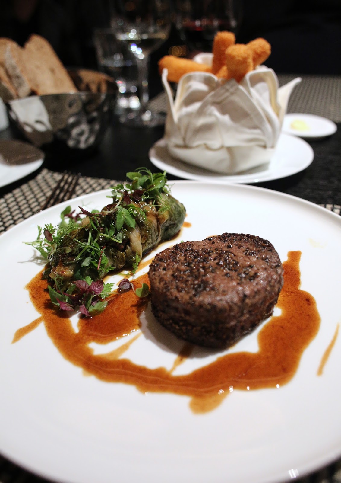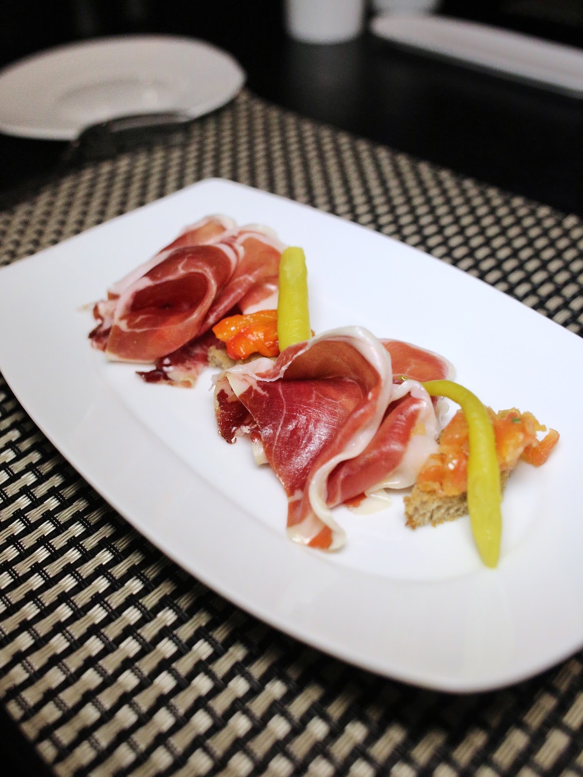 以白酒杯碰杯後,又是時間展開正式晚餐:Chef Frédéric Vardon 的菜單會與巴黎同步化,採不時不食的原則,展現出季節及天然的味道。頭盤我選了 Bellota 頂級黑毛豬火腿 ($60),36個月的火腿油脂豐富、又香又嫩,襯以辣椒、烘麵包、甜椒及蕃茄,簡單得來很合心~