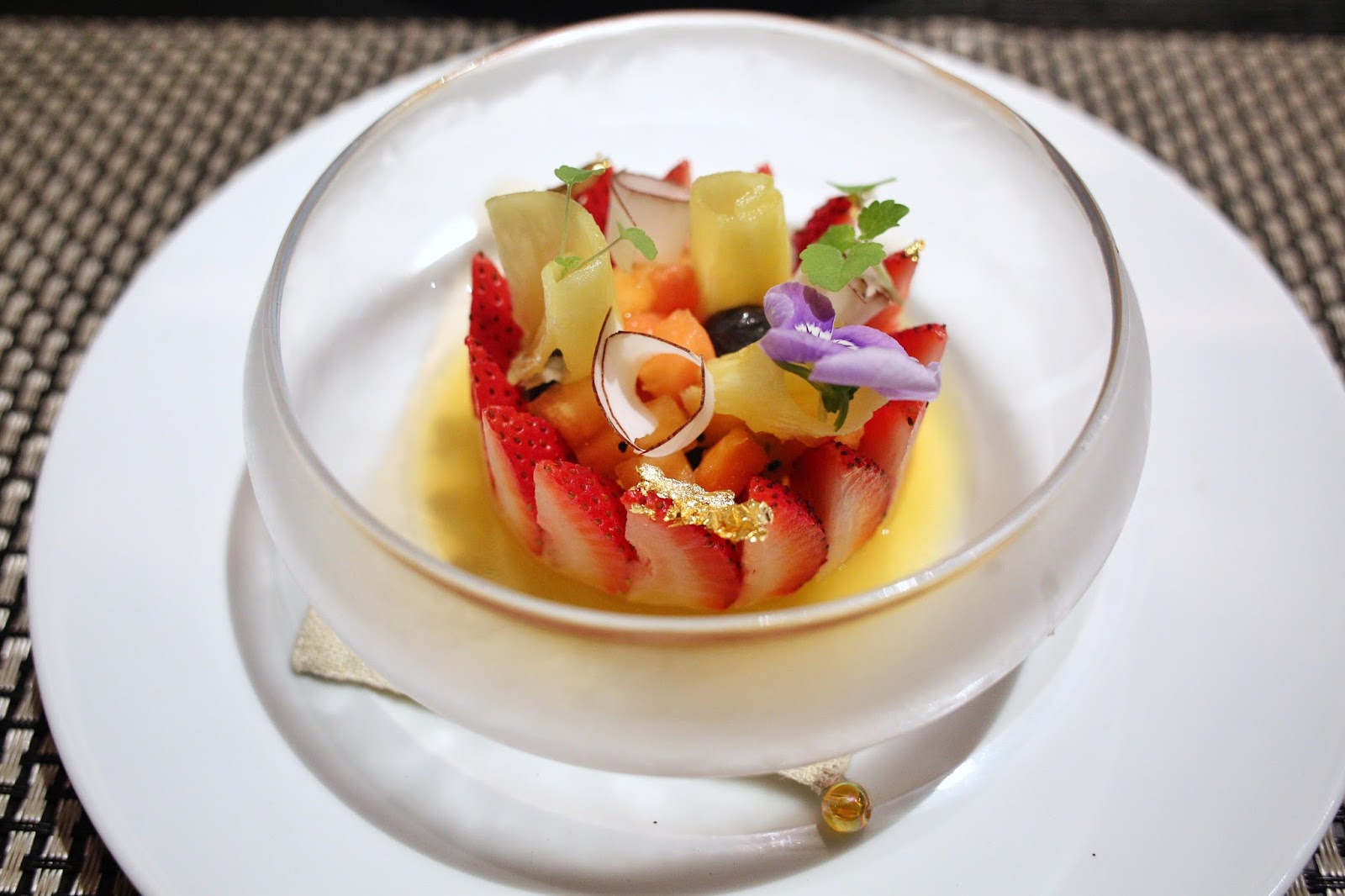 然而再飽也要留肚品嚐這裡的甜品,因為實在款多精緻又吸引啊!先品嚐最清新的 ‘Mixed fruits salad, grapefruit sorbet’ 水果沙律配西柚雪葩 ($230),美如鮮花的時令水果,配上熱情果啫喱、雲尼拿汁,以及額外西柚雪葩,正好一解主菜的膩滯,又可以向更多甜品進發了!