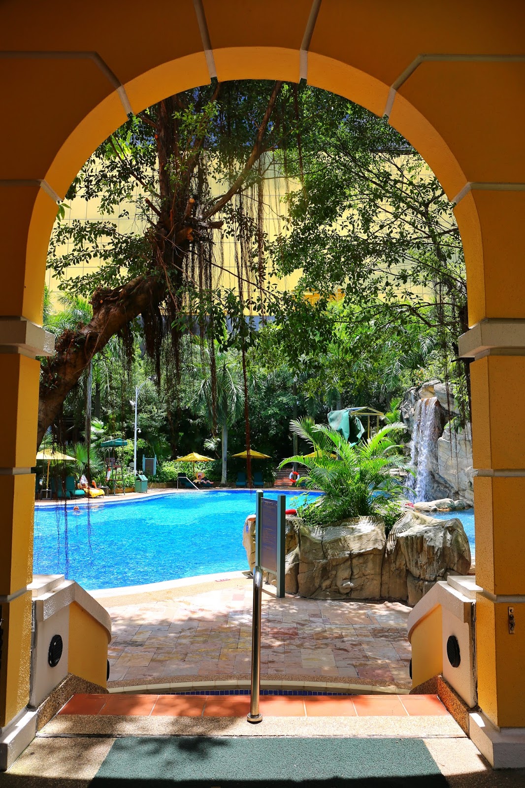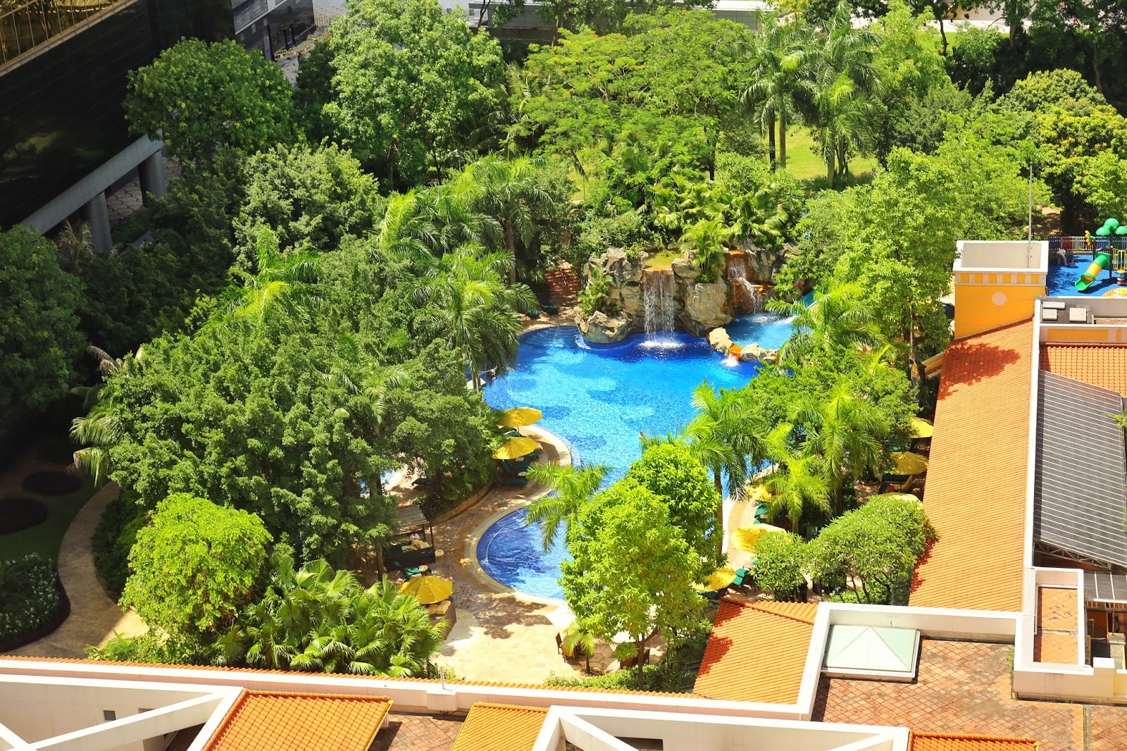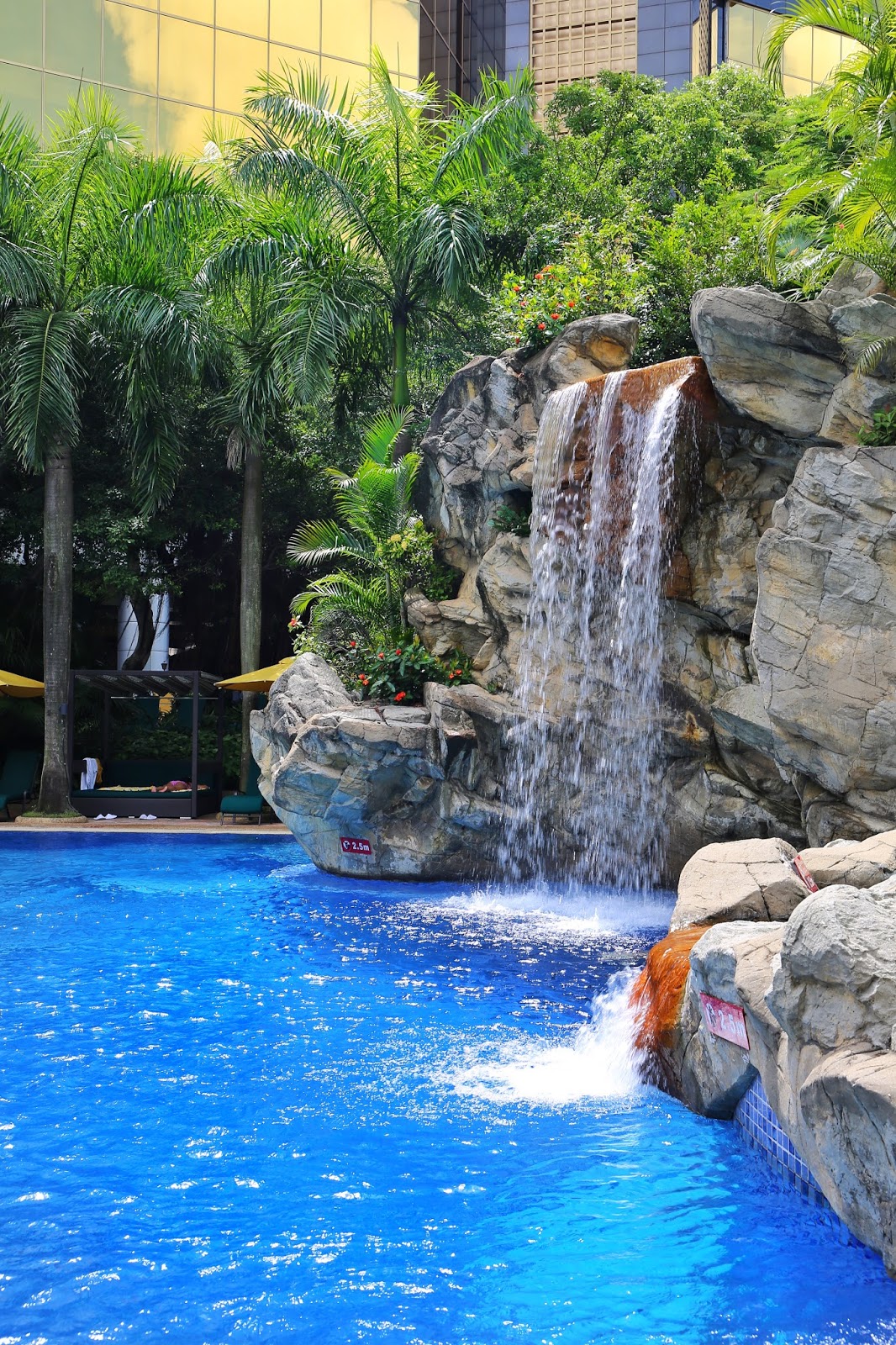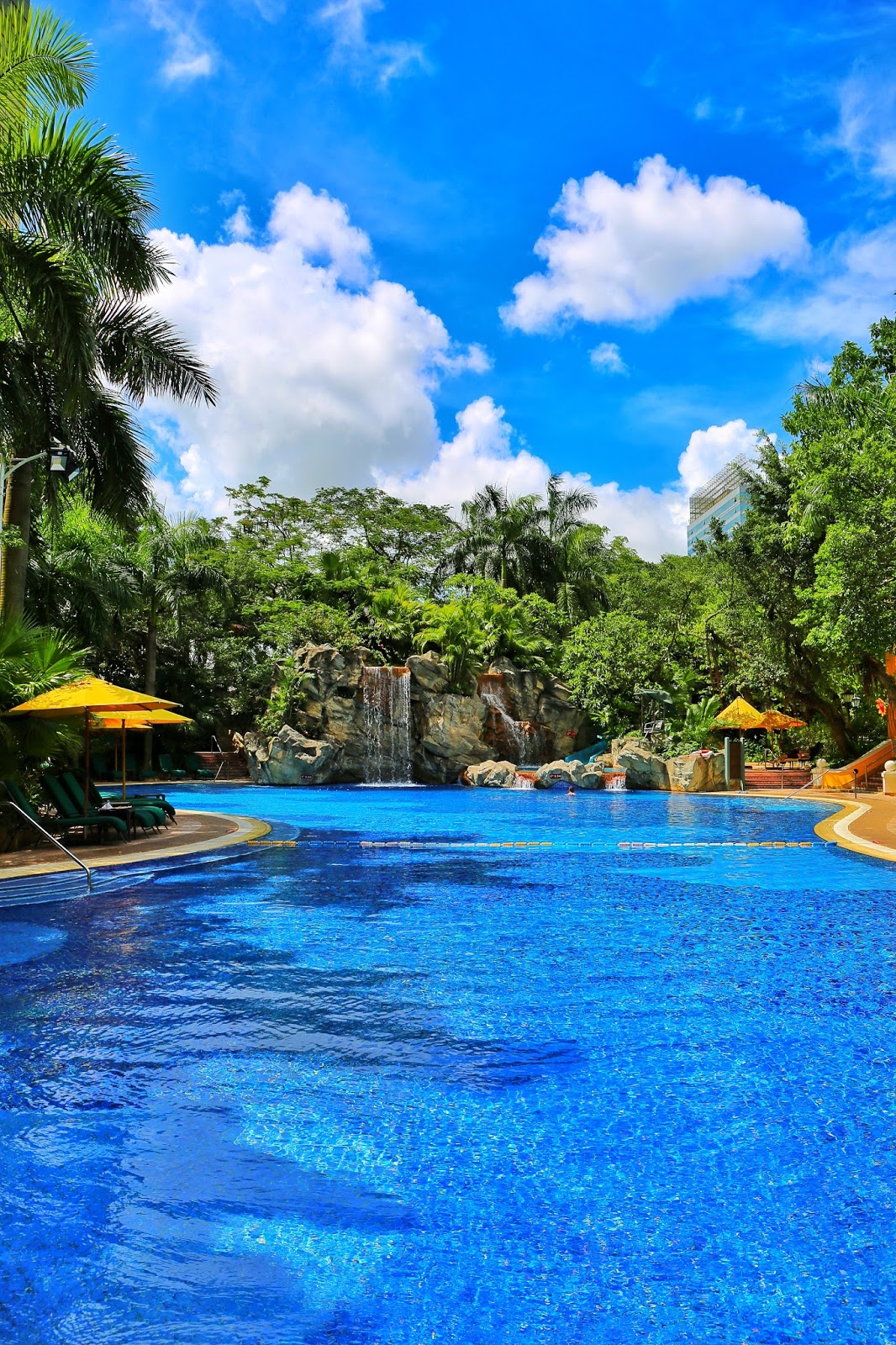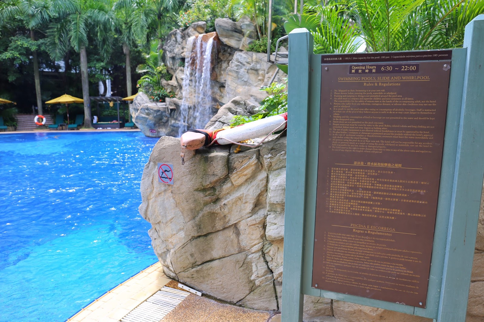 更棒的,是連同滑水梯及瀑布的特大室外園林泳池,尤其在藍天白雲之下,環境美絕了!怎樣拍也是一張明信片!