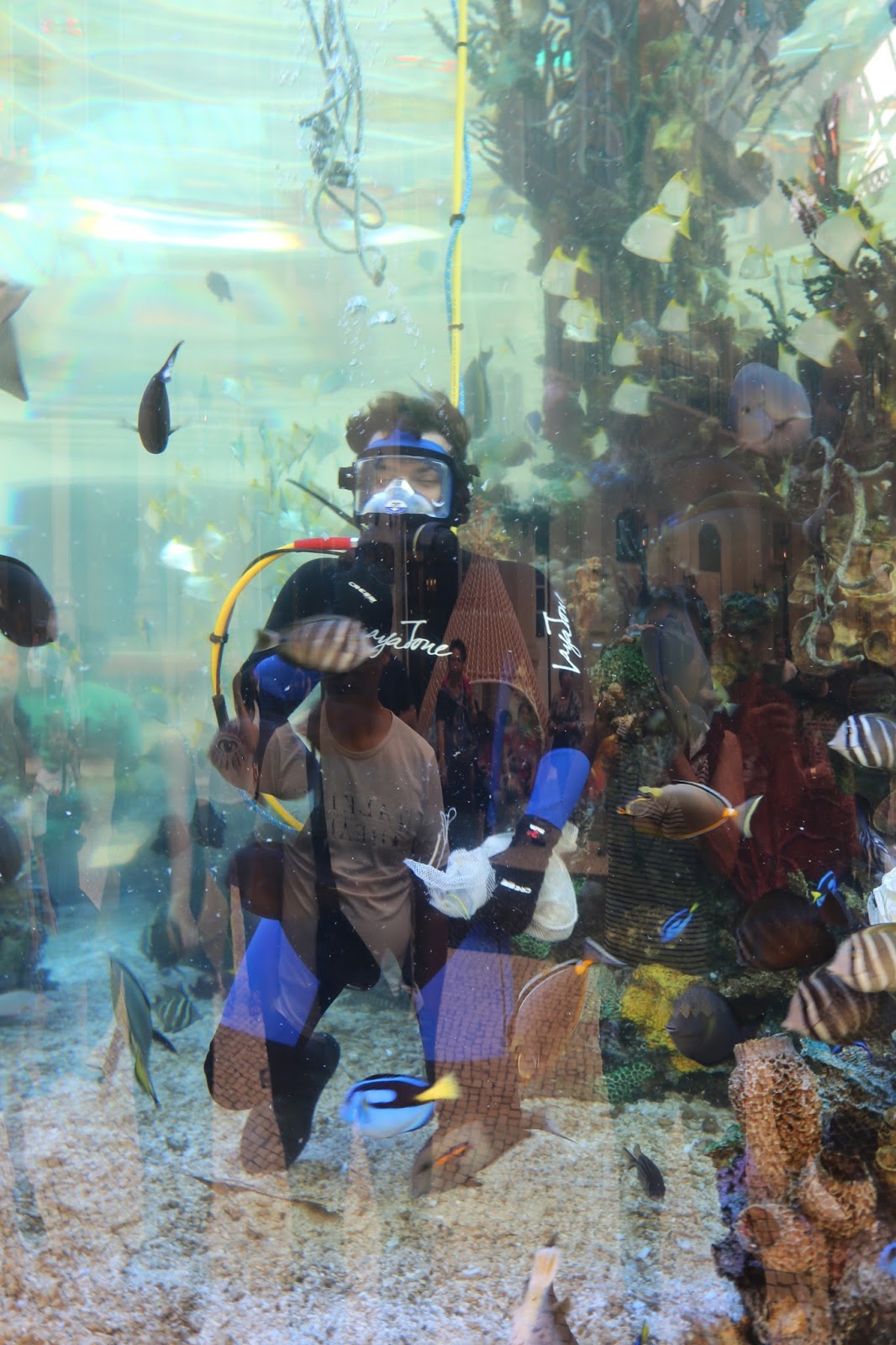 抵達時差不多三點,正好可以欣賞到潛水員餵魚的盛況!由於水族缸中除了食肉的魚,也有食素的魚,所以飼料也是有肉有素,非常豐富的呢~