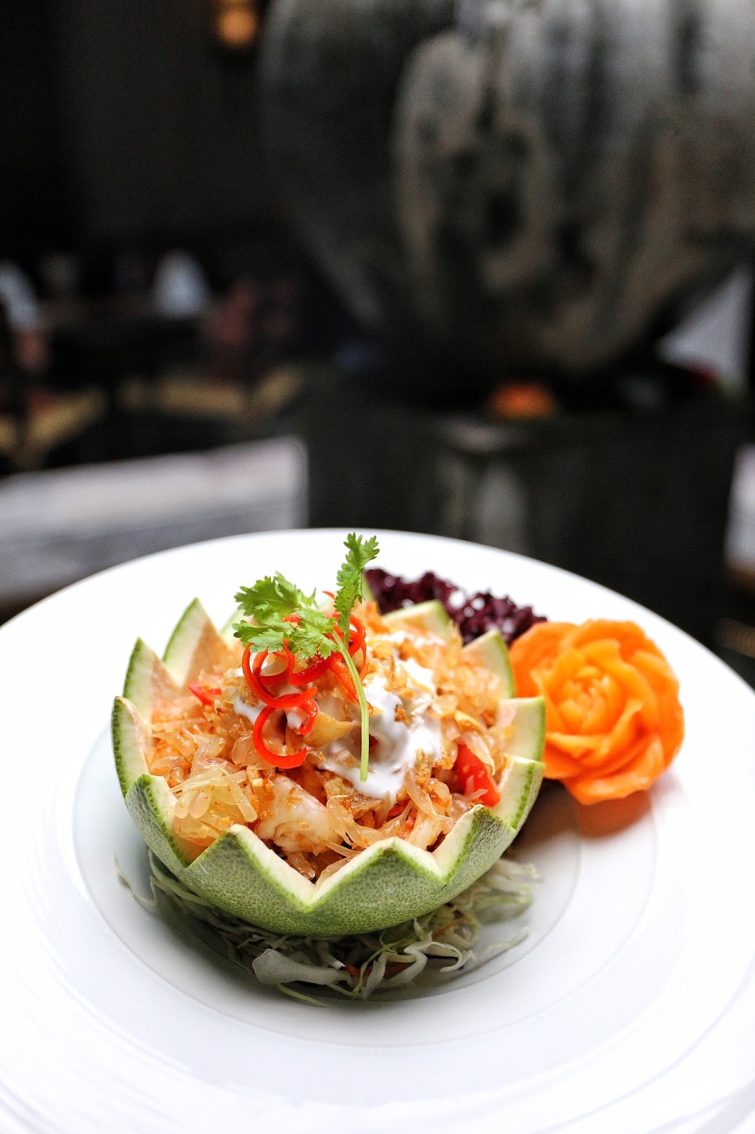 頭盤也開始慢慢上檯,這 Central Thai style Siamese-herbed pomelo salad with prawns 泰式暹邏香草柚子蝦沙律 (MOP $105) 又美又清新好吃,簡單是炎炎夏日最佳開胃頭盤!