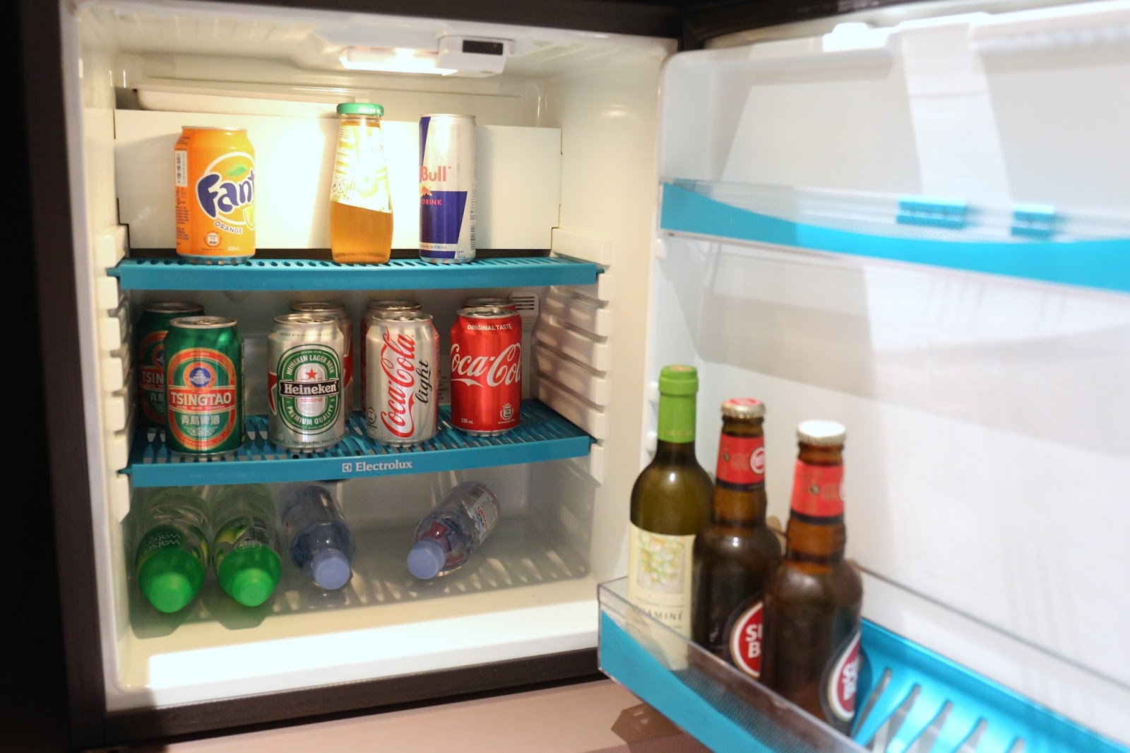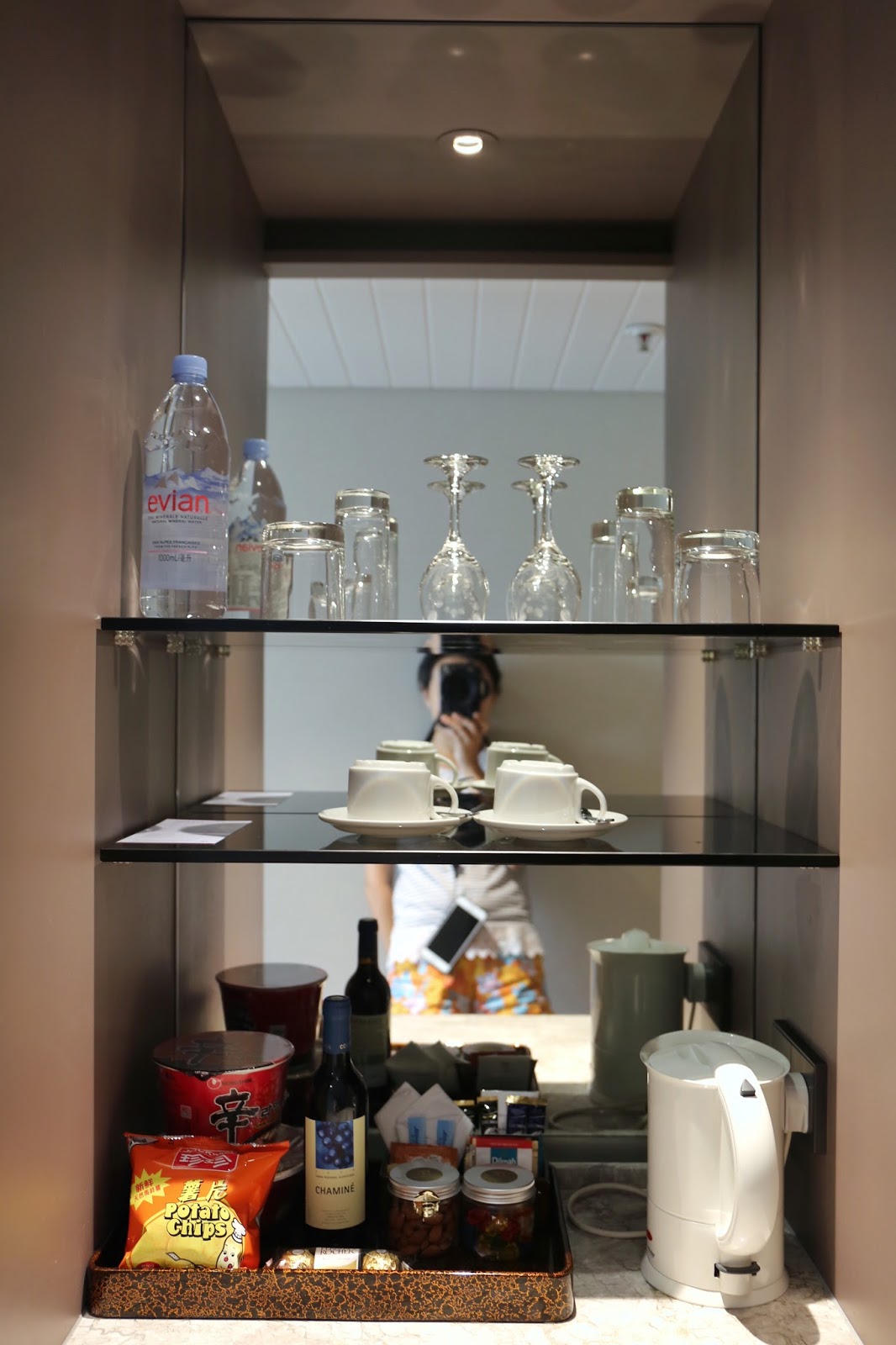 通往房門/洗手間的走廊上,則有冰箱、飲品小食吧,可以滿足客人泡茶、泡咖啡等要求,當然冰箱內的飲品就要另外收費了~