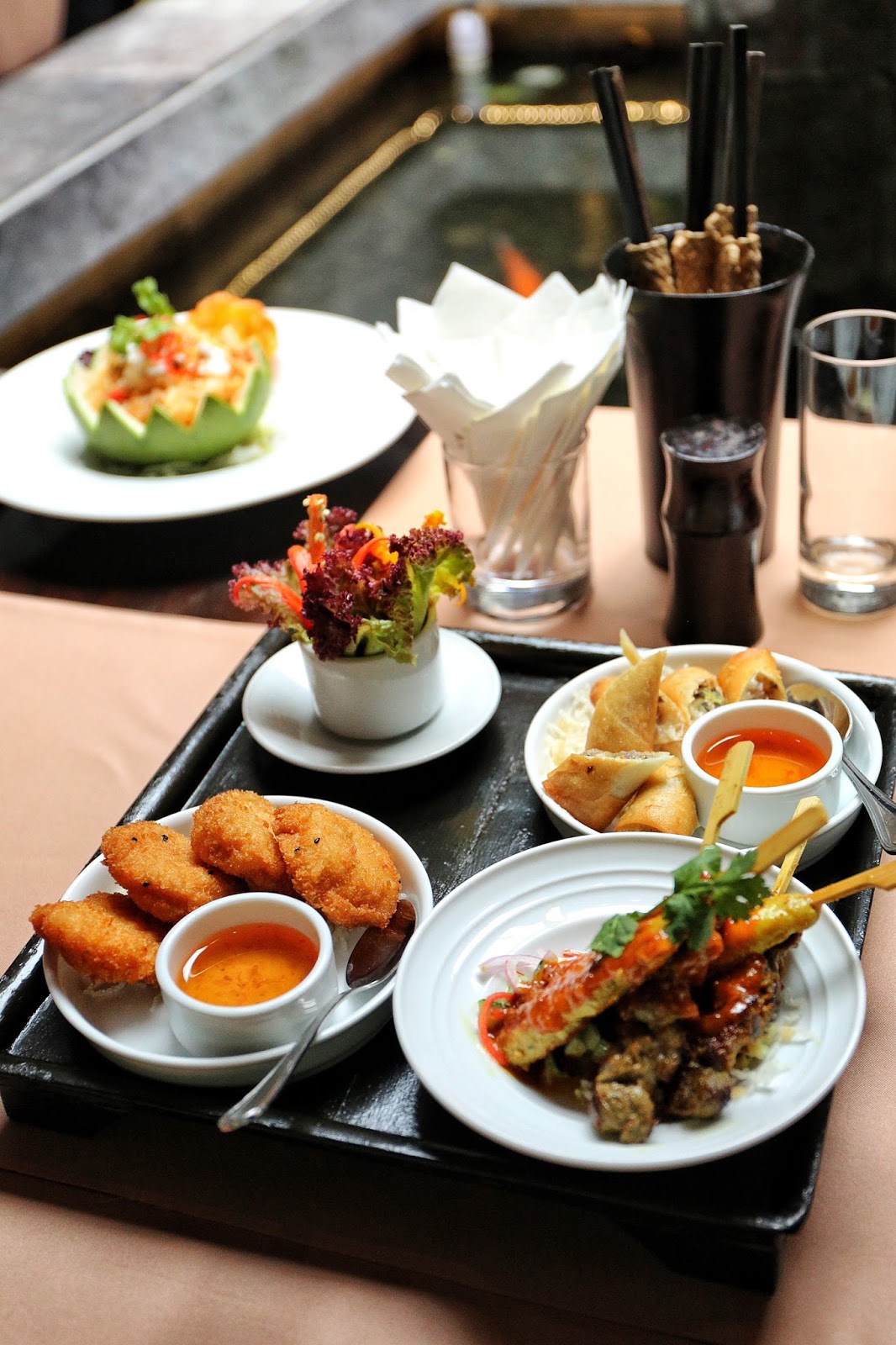 然後是 Sampler of appetizers 自選小食配搭 (兩款 MOP $140/三款 MOP $190/四款 MOP $245), 我試了炸蝦餅配甜酸醬、牛肉及雞肉沙嗲,還有炸素菜春卷都香口不油,配搭醬汁享用更是滋味無比。