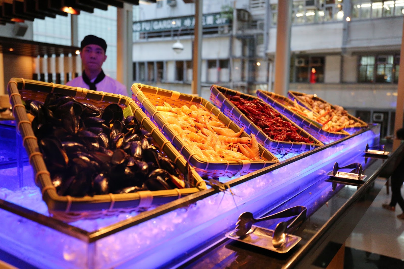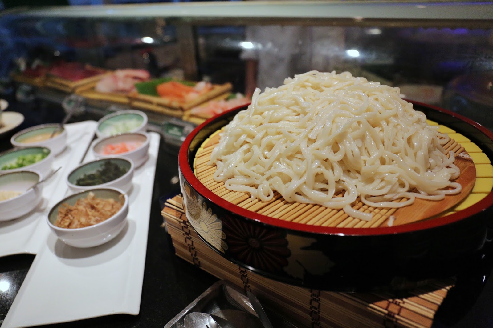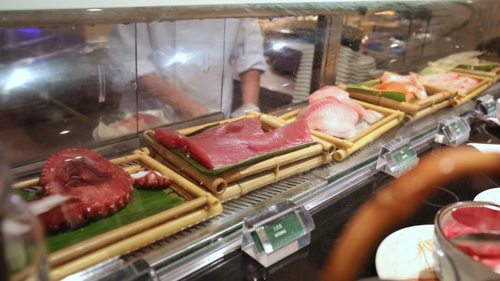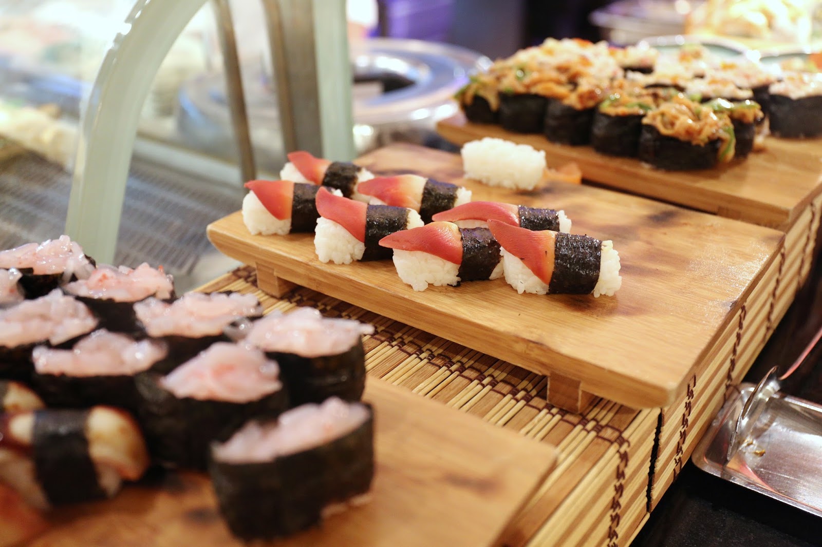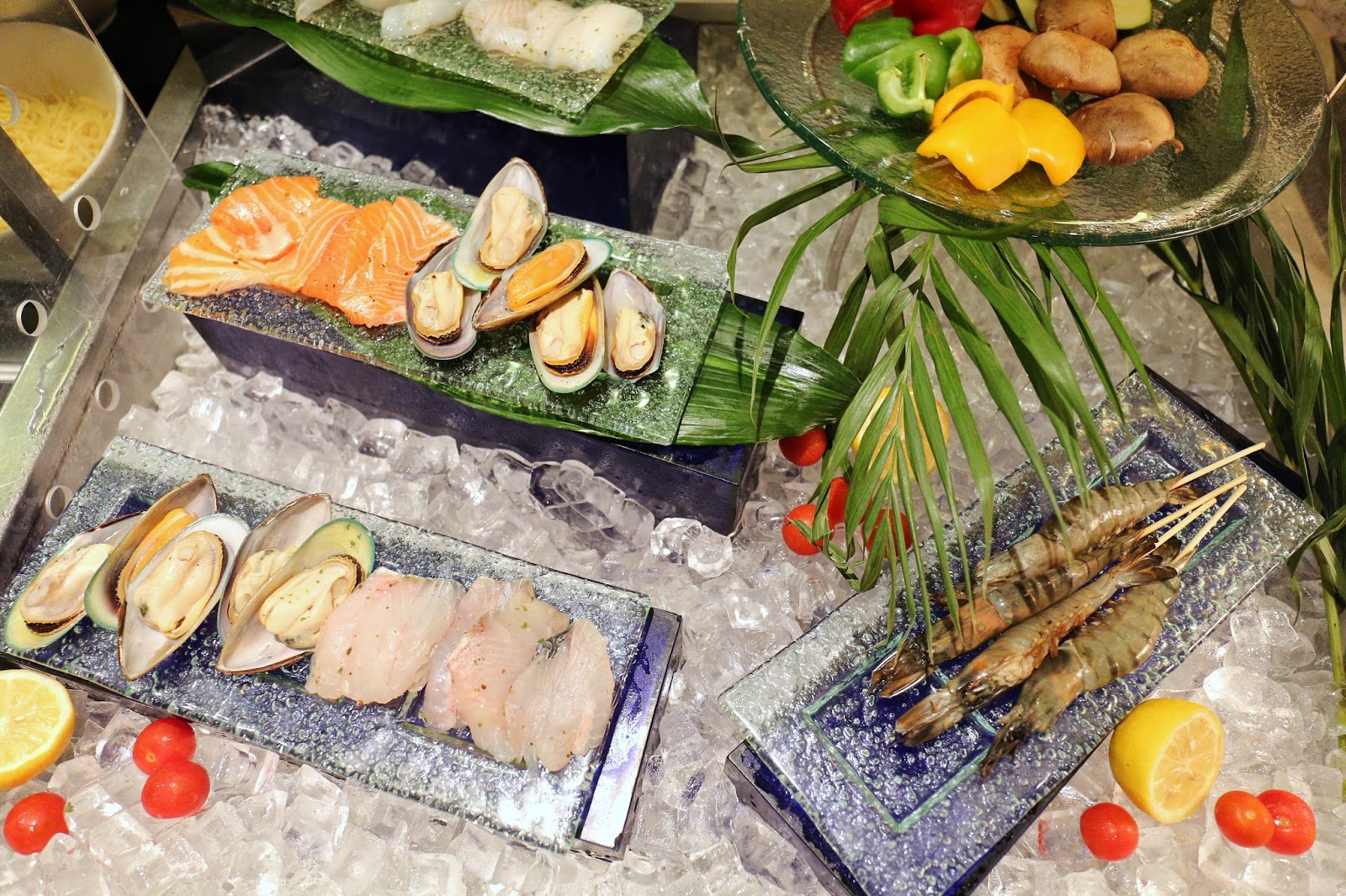 背靠海鮮吧的刺身櫃選擇也不少:三文魚、甜蝦、吞拿魚、八爪魚、鯛魚、仿鮑魚片等等,都是新鮮即點即切,源源不絕奉上。同場也有不同款的卷物、壽司、天婦羅以及冷麵等,喜歡和食的朋友,在這區應該會得到滿足~