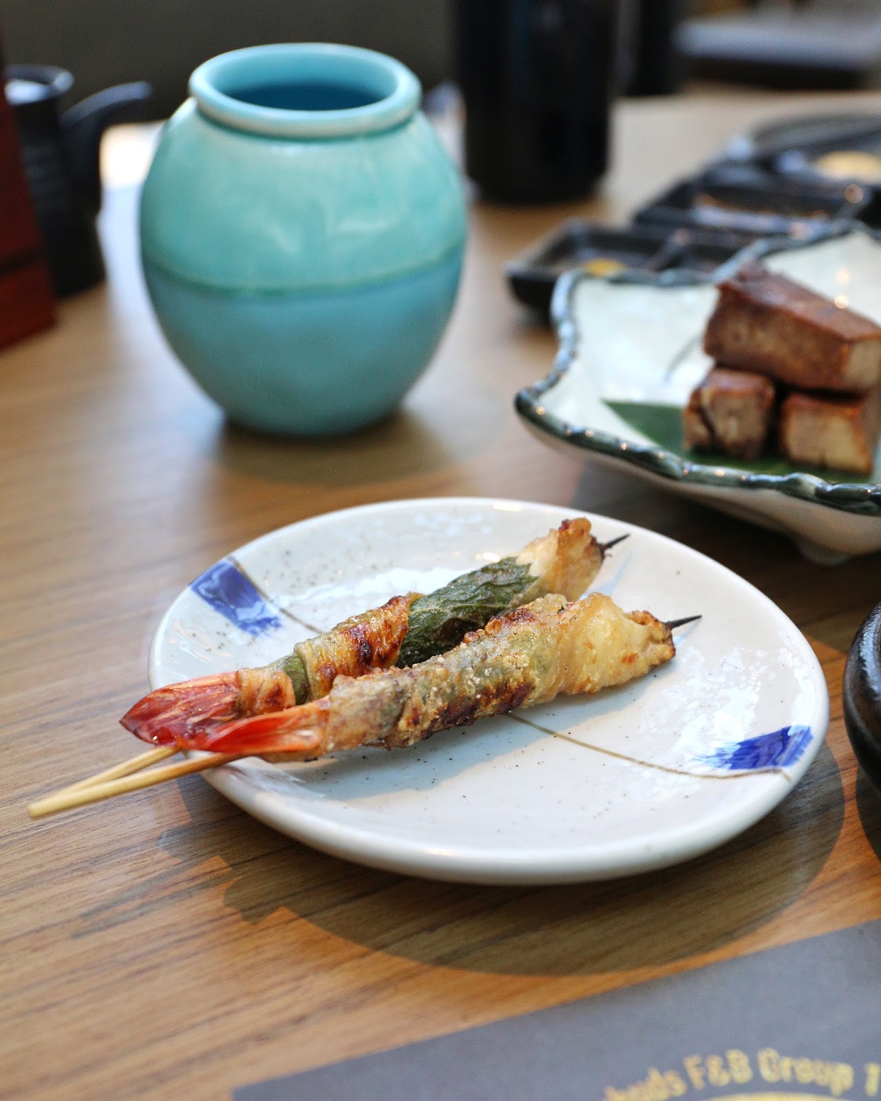 還有 紫蘇葉雞皮蝦卷串,新鮮的加拿大虎蝦已作去殼處理,後,用木籤穿起來。在虎蝦面層又卷上一塊紫蘇葉,再加新鮮雞皮,口感豐富香脆又清香,味道非常豐富呢!