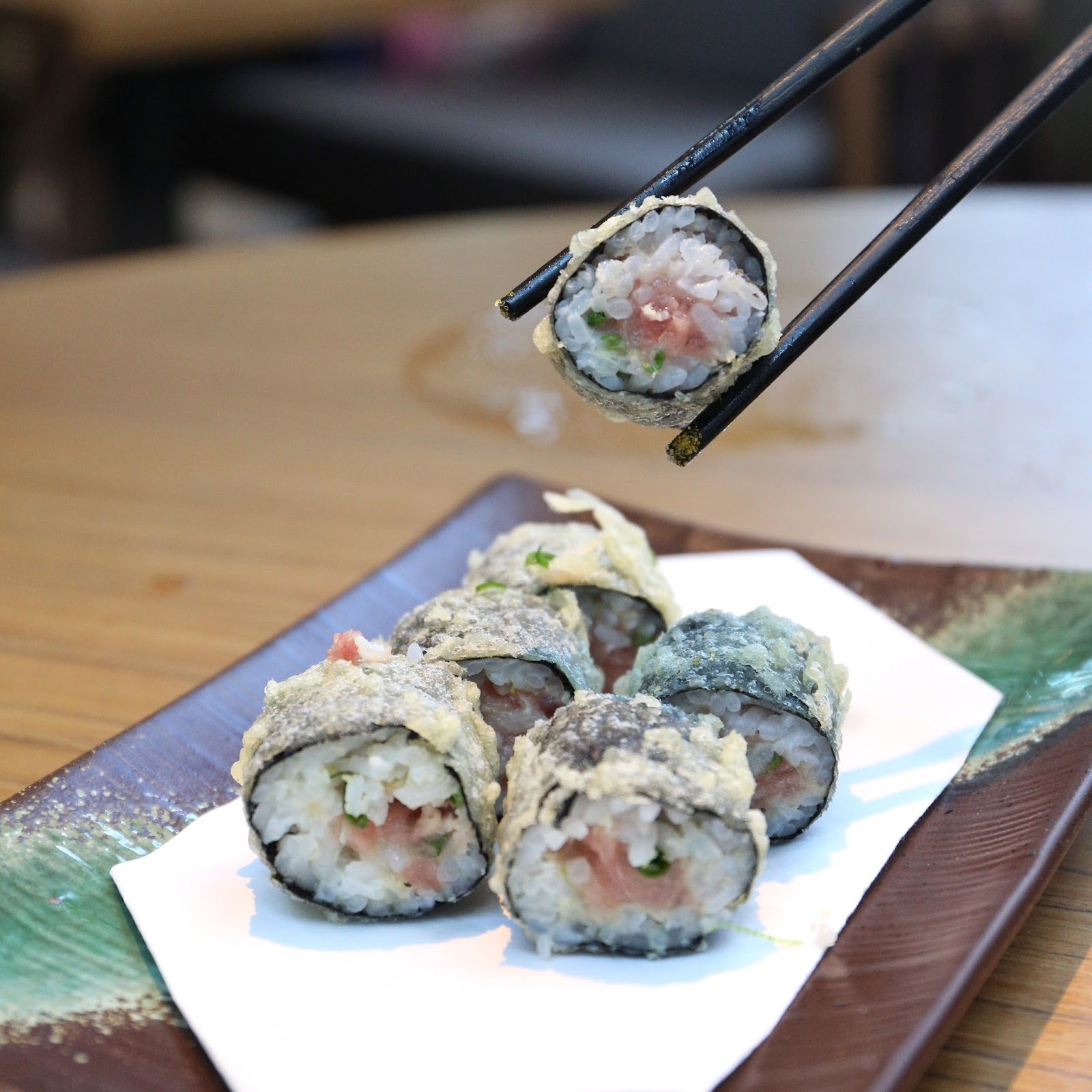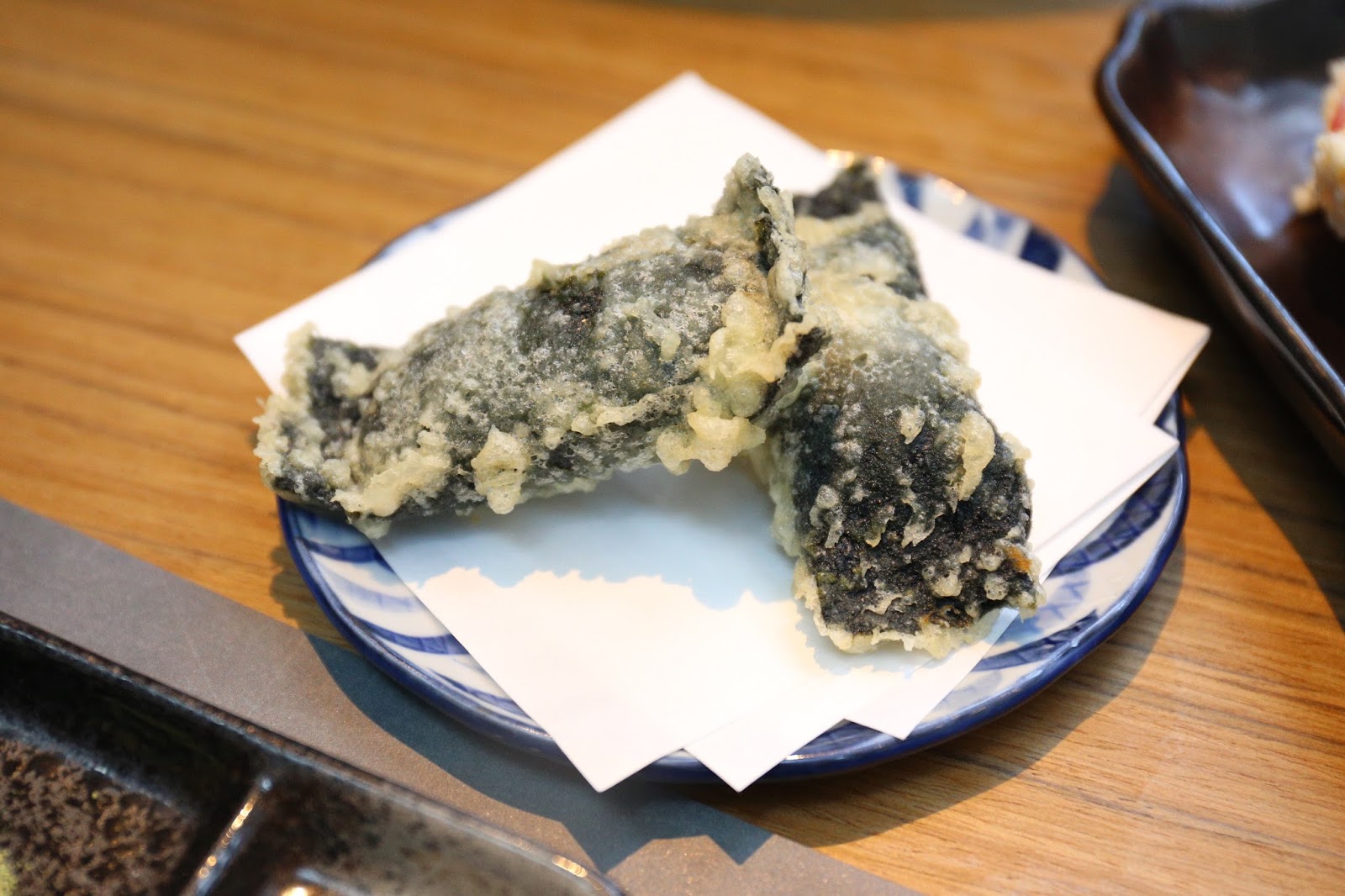 接著開始香口美食,首先是 三蟹卷天扶良。天婦羅炸功一流,成品一點不油不膩,薄脆的外層之下,是爽甜鮮濃的蟹子、蟹肉和蟹黃,不用點任何調味已經非常美味了!