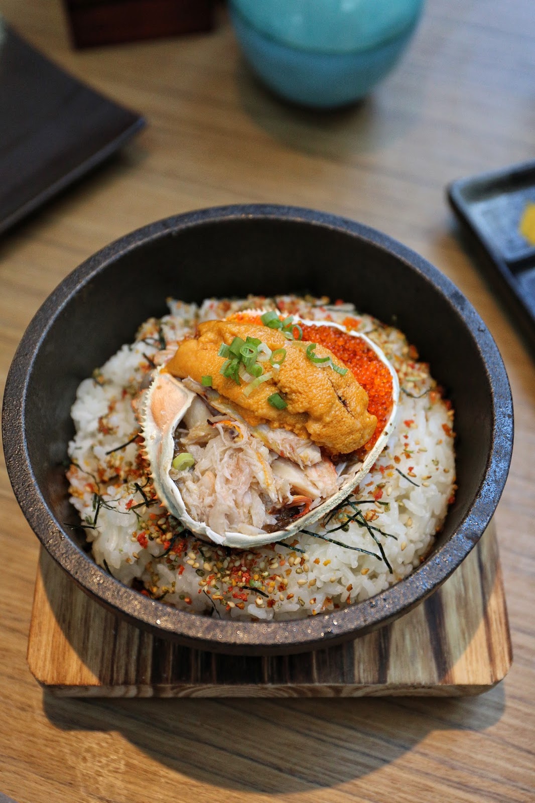 最後壓輻是 松葉蟹蓋海膽石鍋飯,進食前要將松葉蟹蓋內的松葉蟹膏、松葉蟹肉、松葉蟹肉籽和馬糞海膽一起倒入石鍋裏拌飯,加上飯裡的明太子飯素、紫菜和芝麻,鮮香滿瀉,味道及口感都極其豐富,吃完200%滿足了!