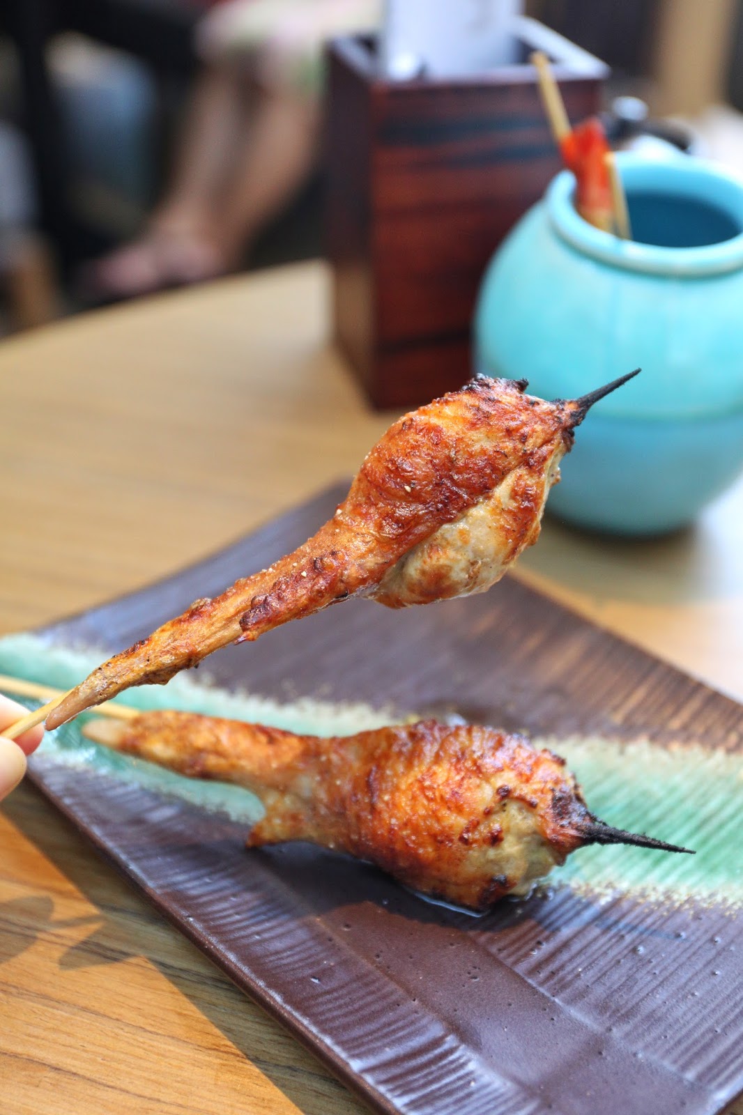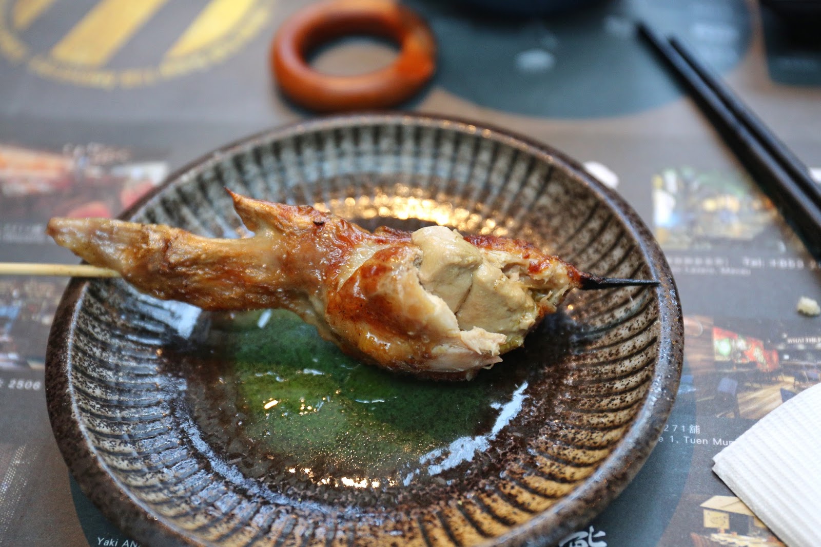 繼續有邪惡的 鵝肝釀雞翼,大廚以法國鵝肝釀入雞翼中,再將雞翼燒至外脆內軟,香口豐腴的滋味令人難忘;吃時可配上3款特色燒烤鹽(海鹽、抹茶和咖喱味),當中清新的抹茶鹽是我心水。