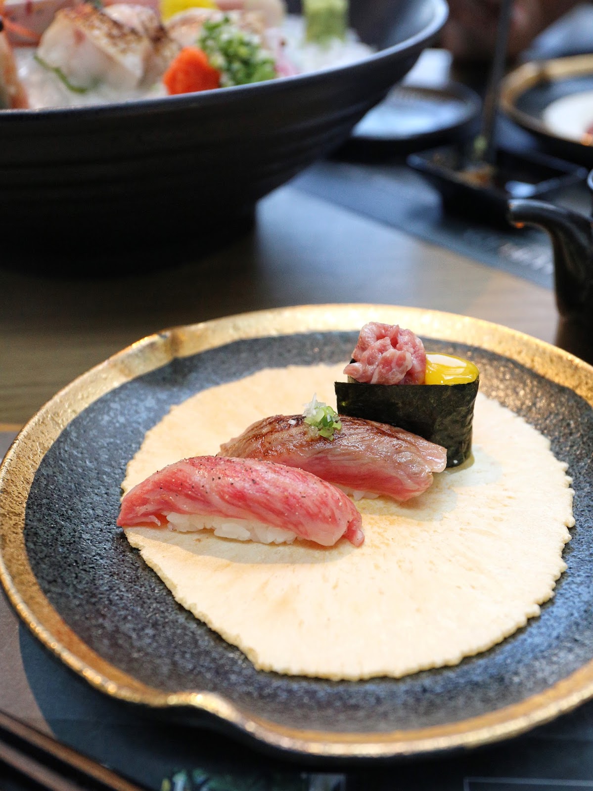 也品嚐了 飛驒牛壽司三點盛,著名的飛驒牛以牛味極濃、肉質鮮嫩而且油脂分布均勻見稱,這次同時可品嚐醬油、火炙和軍艦配鵪鶉蛋三款壽司吃法,風味各異但都非常美味;壽司又盛在脆薄蝦片上,甚有日本街頭文化的風情,非常討喜。