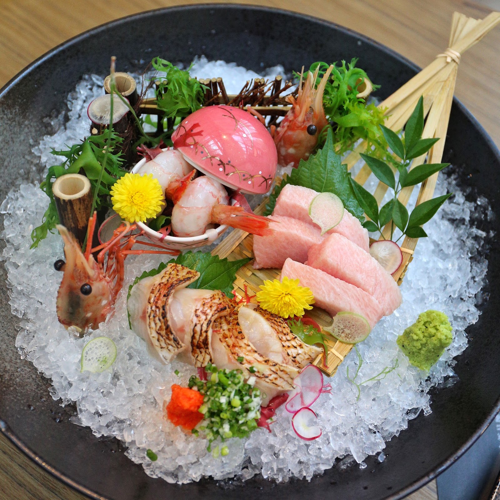 接著再來華麗奪目、未吃先興奮的 季節刺身三點。輕灸過的金目鯛柔嫩可口,巨大牡丹蝦亦嫩甜可人,令人著迷,但都不及異常豐腴、油花達到極致的大拖羅誘人,真的只融於口啊!