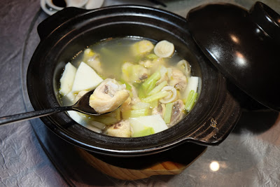 起初望見菜名,誤以為係雙蒸酒,呷一口,絲毫不覺有酒味,而且清甜到一個點,原來是椰子水及椰子肉,之前曾經踫上過用椰子雞湯當火鍋湯底,但都不如這次的鮮甜,原來湯底是以香芹、薑、馬碲、鮮草菇及米酒熬成,難怪!