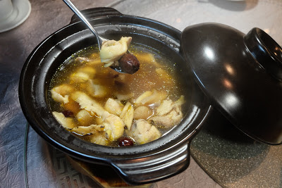 原個燉盅上, 熱到辣口, 湯色清澈, 散發陣陣幽香, 呷一口, 齒頰留香, 甘香醇厚,舀一下,湯料有鮑魚、花膠、海参及上肉,夠晒滋潤。