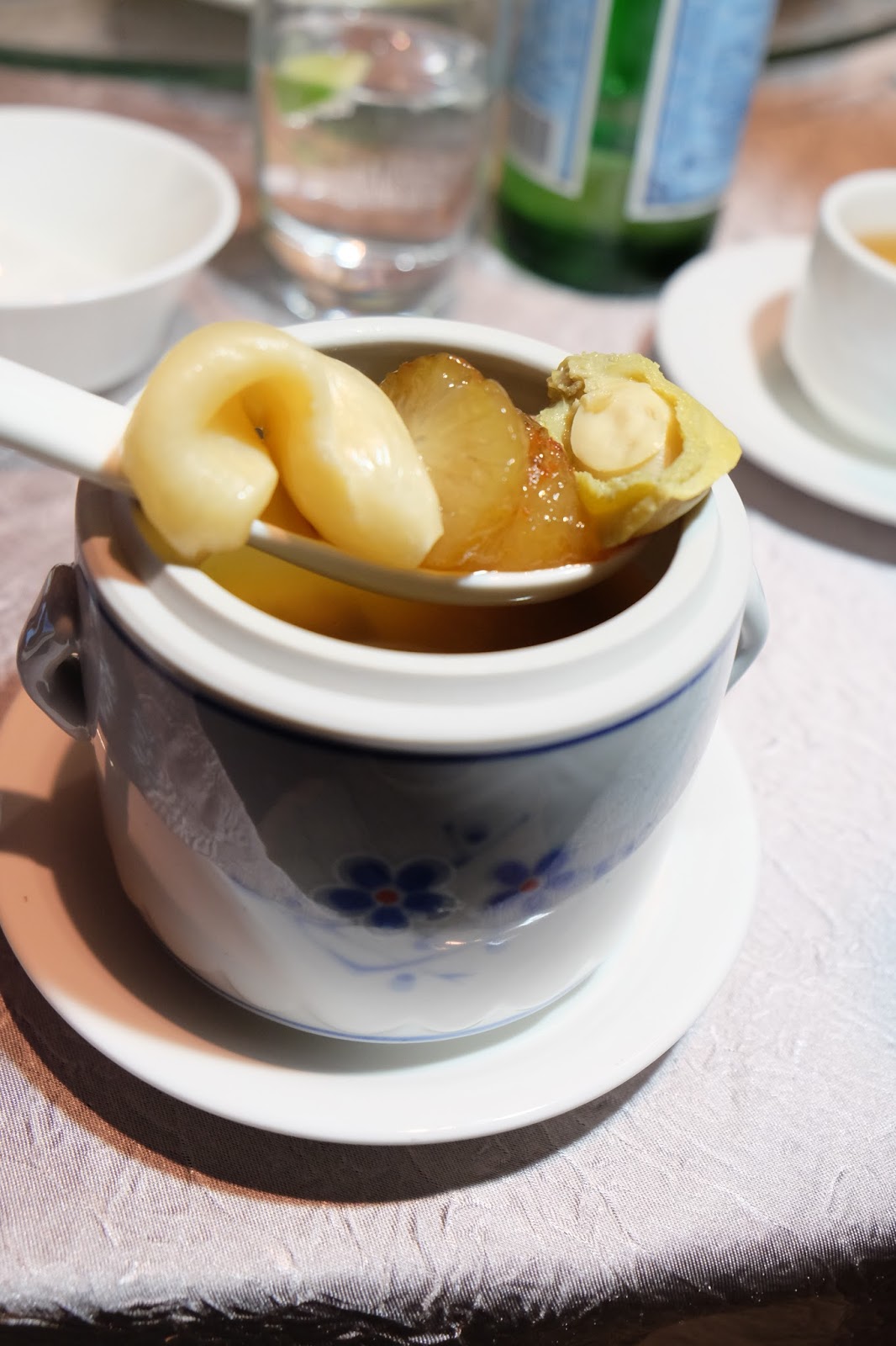 原個燉盅上, 熱到辣口, 湯色清澈, 散發陣陣幽香, 呷一口, 齒頰留香, 甘香醇厚,舀一下,湯料有鮑魚、花膠、海参及上肉,夠晒滋潤。