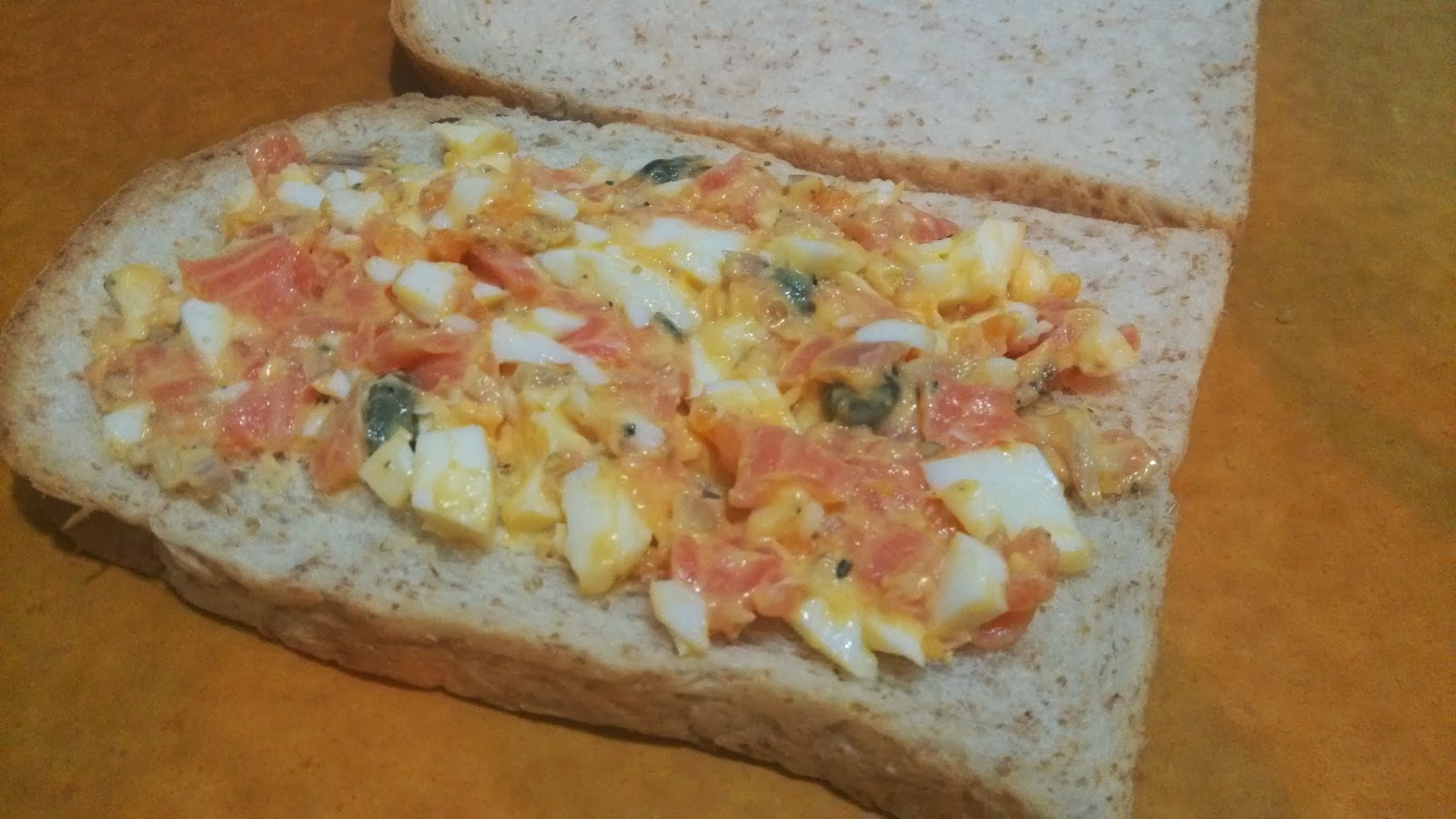 然後把煙三文魚蛋沙律鋪在包包上, 完成.